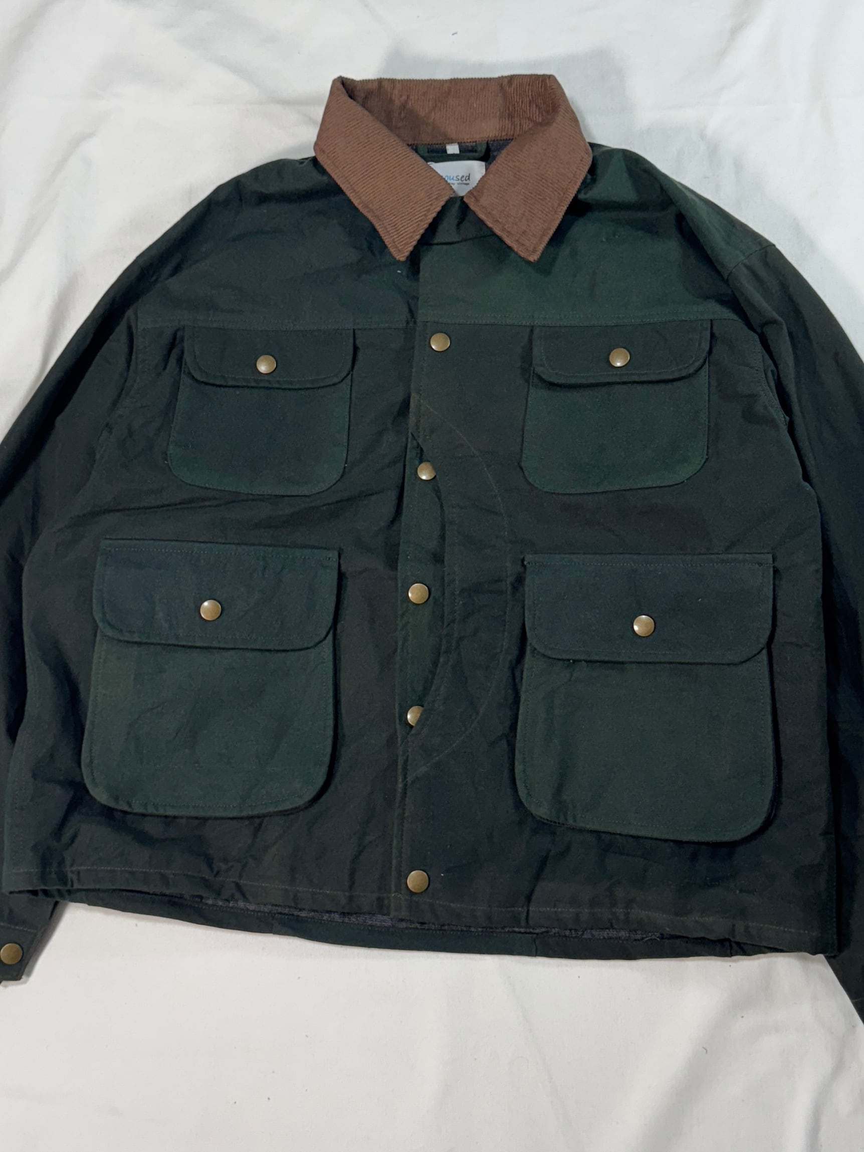 こちらの商品はサイズ1、SAGE(オリーブ)系のカラーで、ポケットは前身頃にハーフムーンポケットを含めて5箇所、さらに裏地にも2箇所、合計7箇所と収納力は抜群です。襟・袖裏にはコーデュロイを使用し、裏地はyoused定番のシャンブレー、袖は通しの良いナイロンを使用。ショート丈でシルエットにもこだわったおすすめの1枚です。