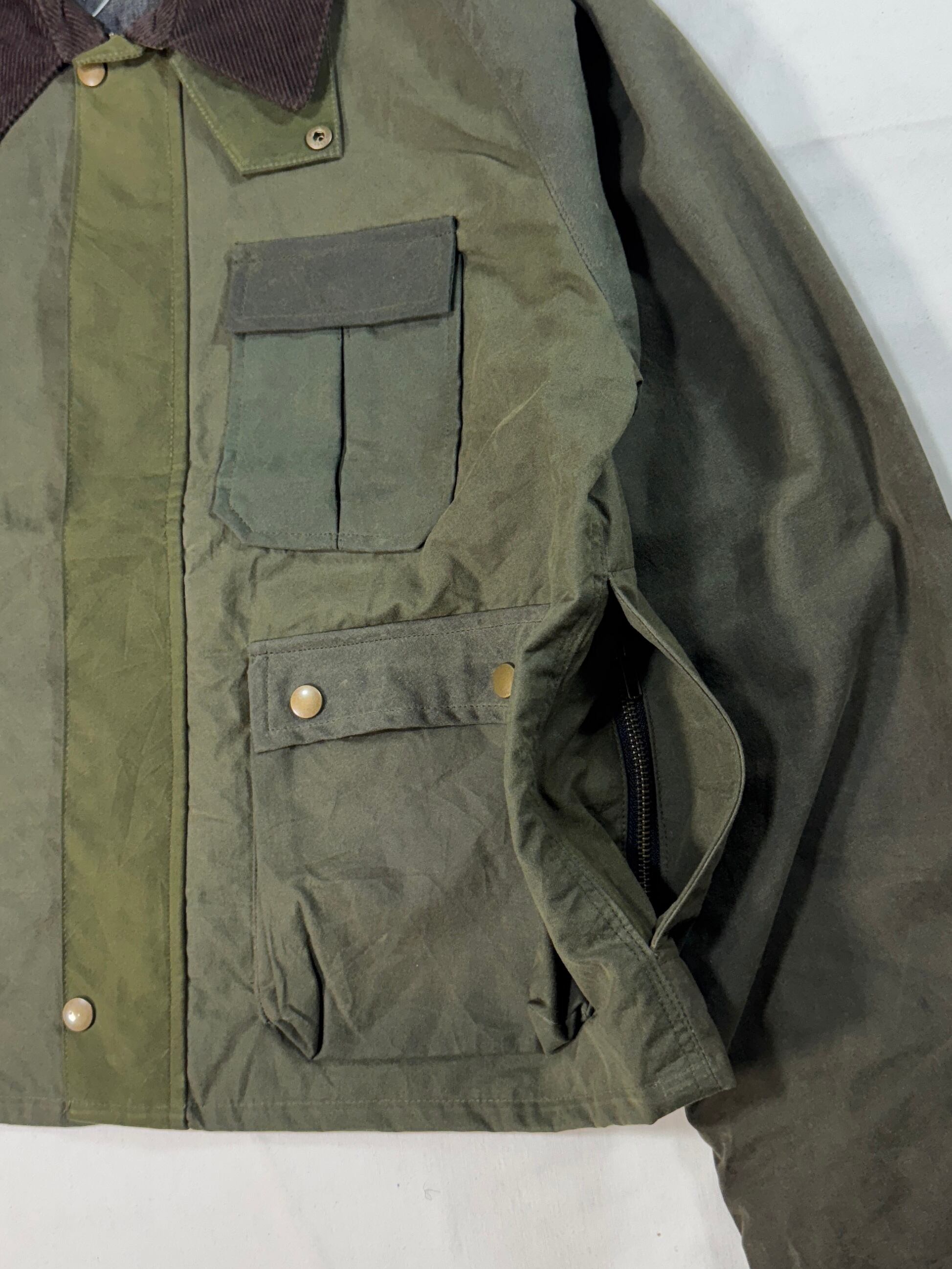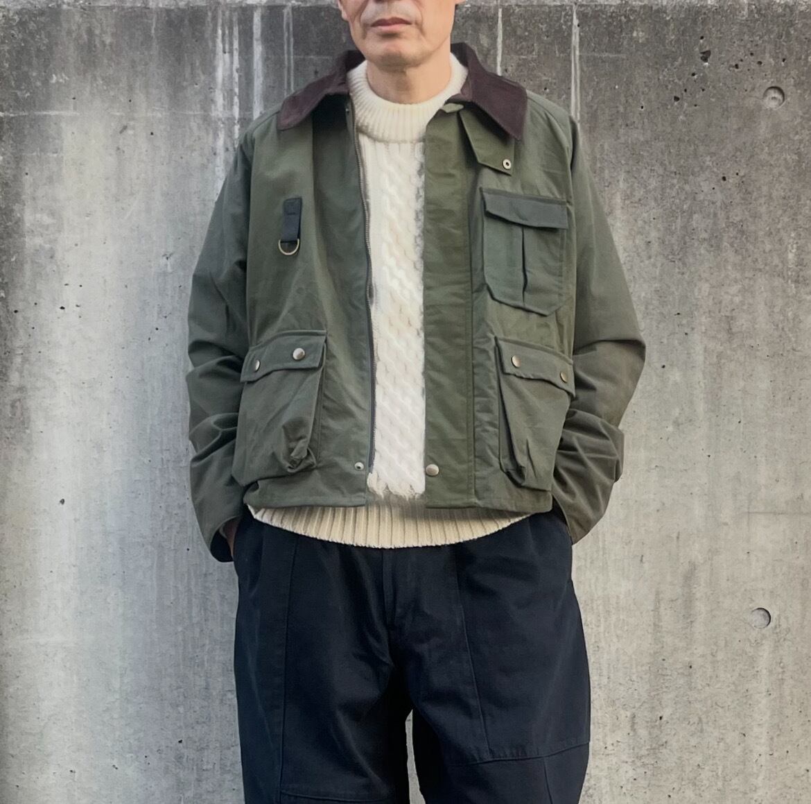 古着のオイルドジャケットを解体し再構築したリメイクフィッシングジャケットです。1枚作るのにジャケットを約2枚使う贅沢な作りです。機能的にも凝っており、サイドに貫通式のゲームポケット(両サイドにジッパーがつきます)、また、胸元にはDリングも付属します。さらに表地と裏地の間にもナイロン生地を挟み防寒性、防水性に優れた1着です。サイズは1 (M). 2 (L)の2サイズ、こちらはサイズ1になります。カラーはSAGE(オリーブ)になります。着画は170cmのものがサイズ1を使用、ゆとりのある作りです。
