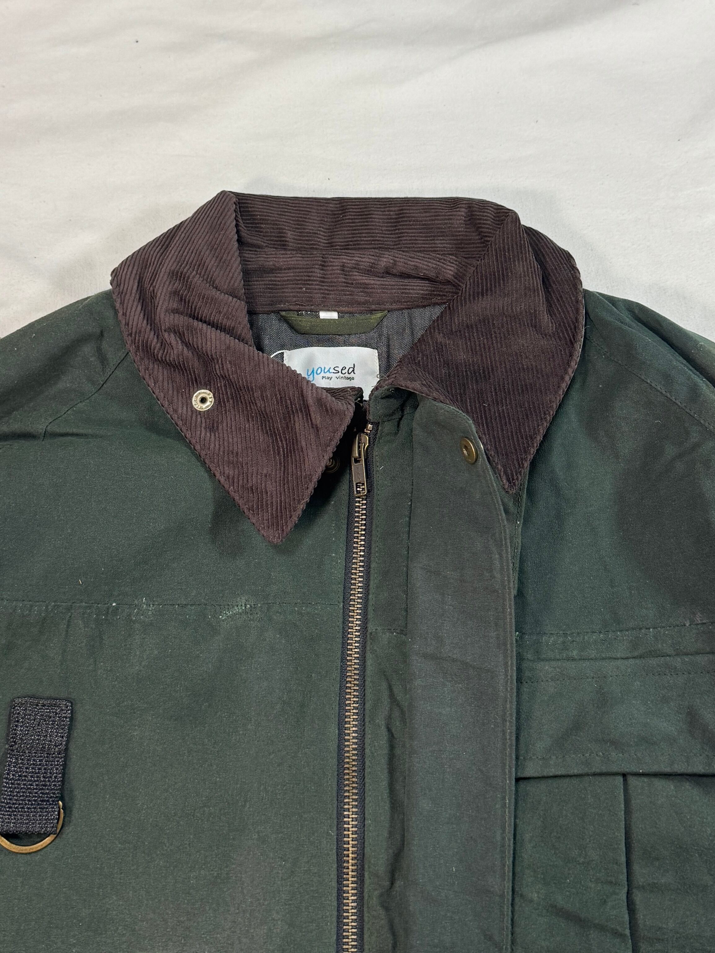 古着のオイルドジャケットを解体し再構築したリメイクフィッシングジャケットです。1枚作るのにジャケットを約2枚使う贅沢な作りです。機能的にも凝っており、サイドに貫通式のゲームポケット(両サイドにジッパーがつきます)、また、胸元にはDリングも付属します。さらに表地と裏地の間にもナイロン生地を挟み防寒性、防水性に優れた1着です。サイズは1 (M). 2 (L)の2サイズ、こちらはサイズ1になります。カラーはSAGE(オリーブ)になります。着画は170cmのものがサイズ1を使用、ゆとりのある作りです。