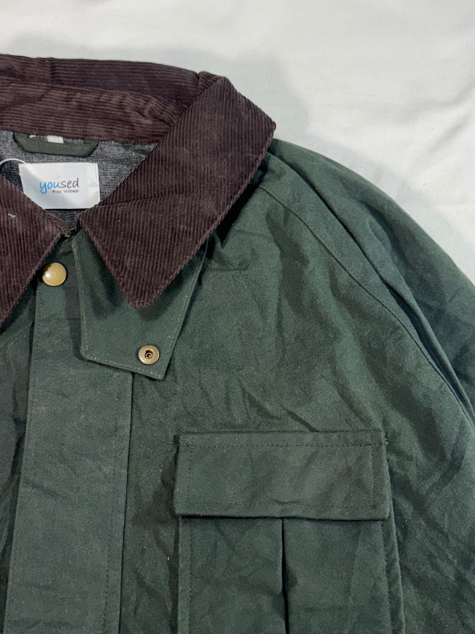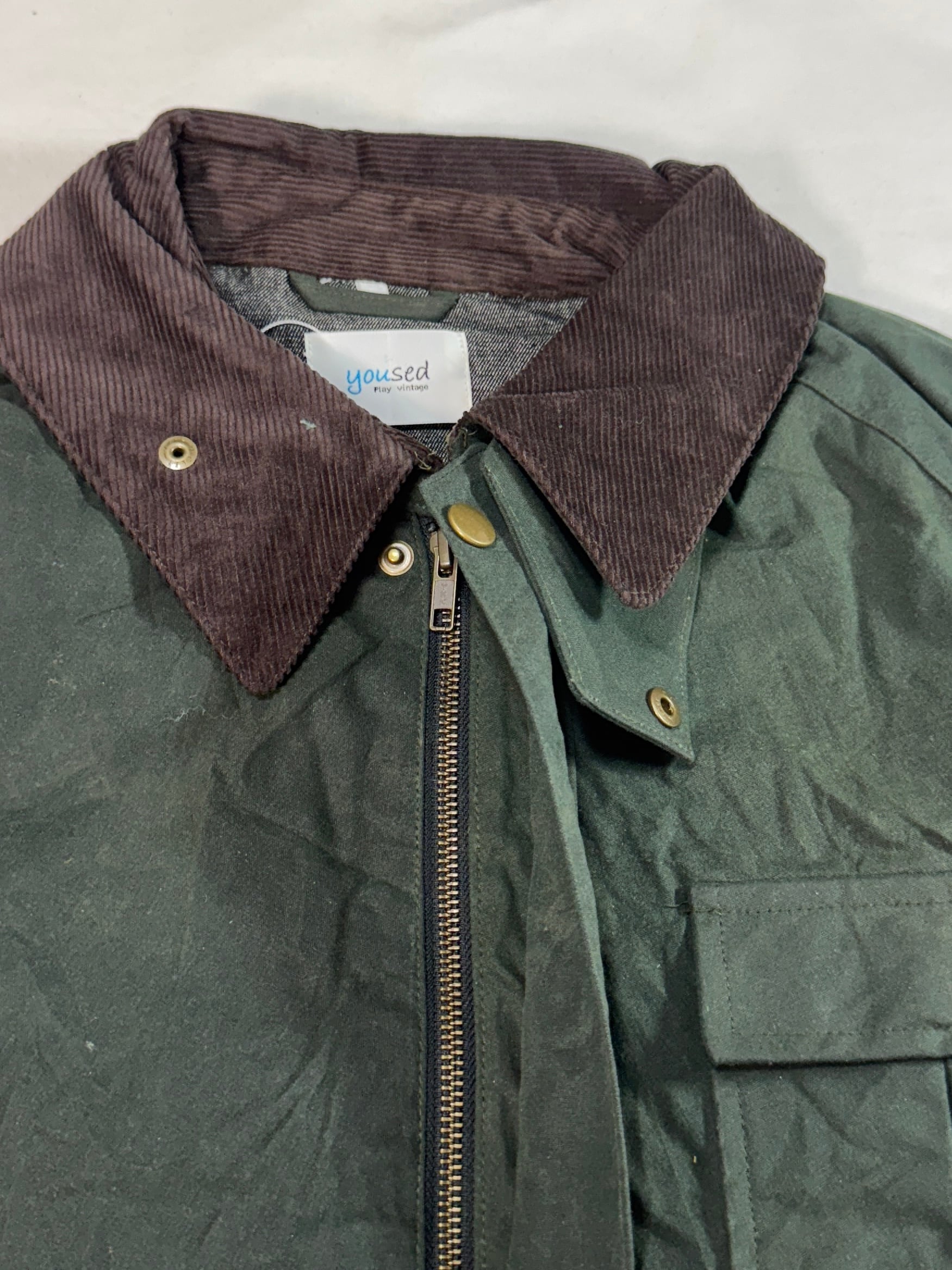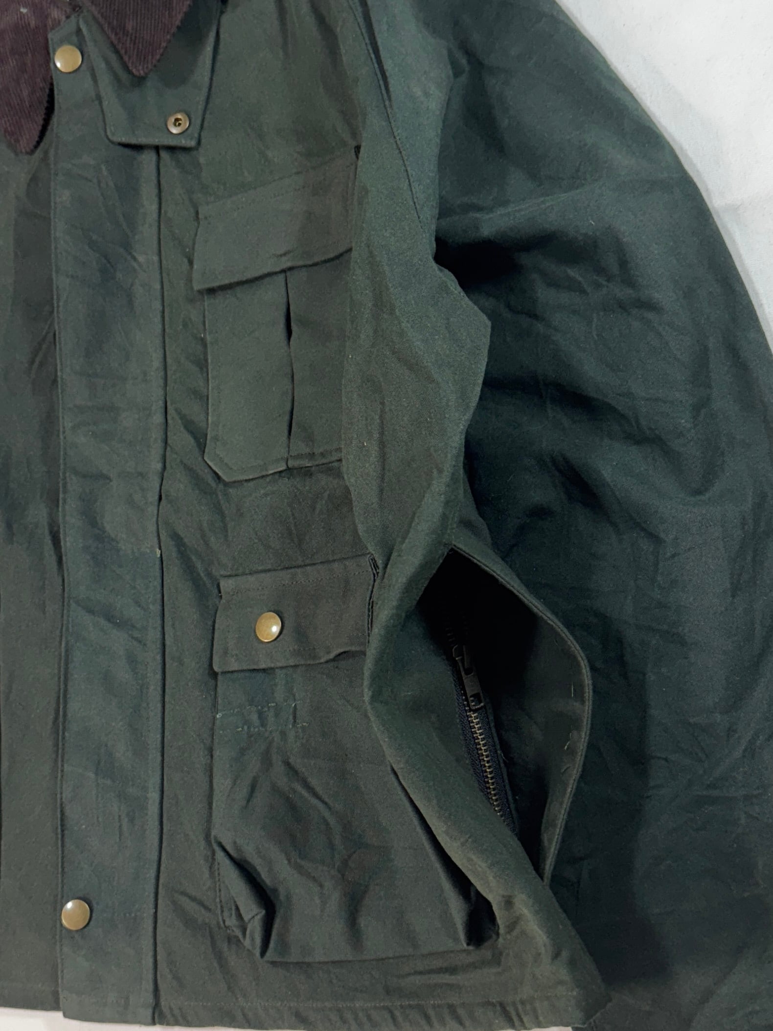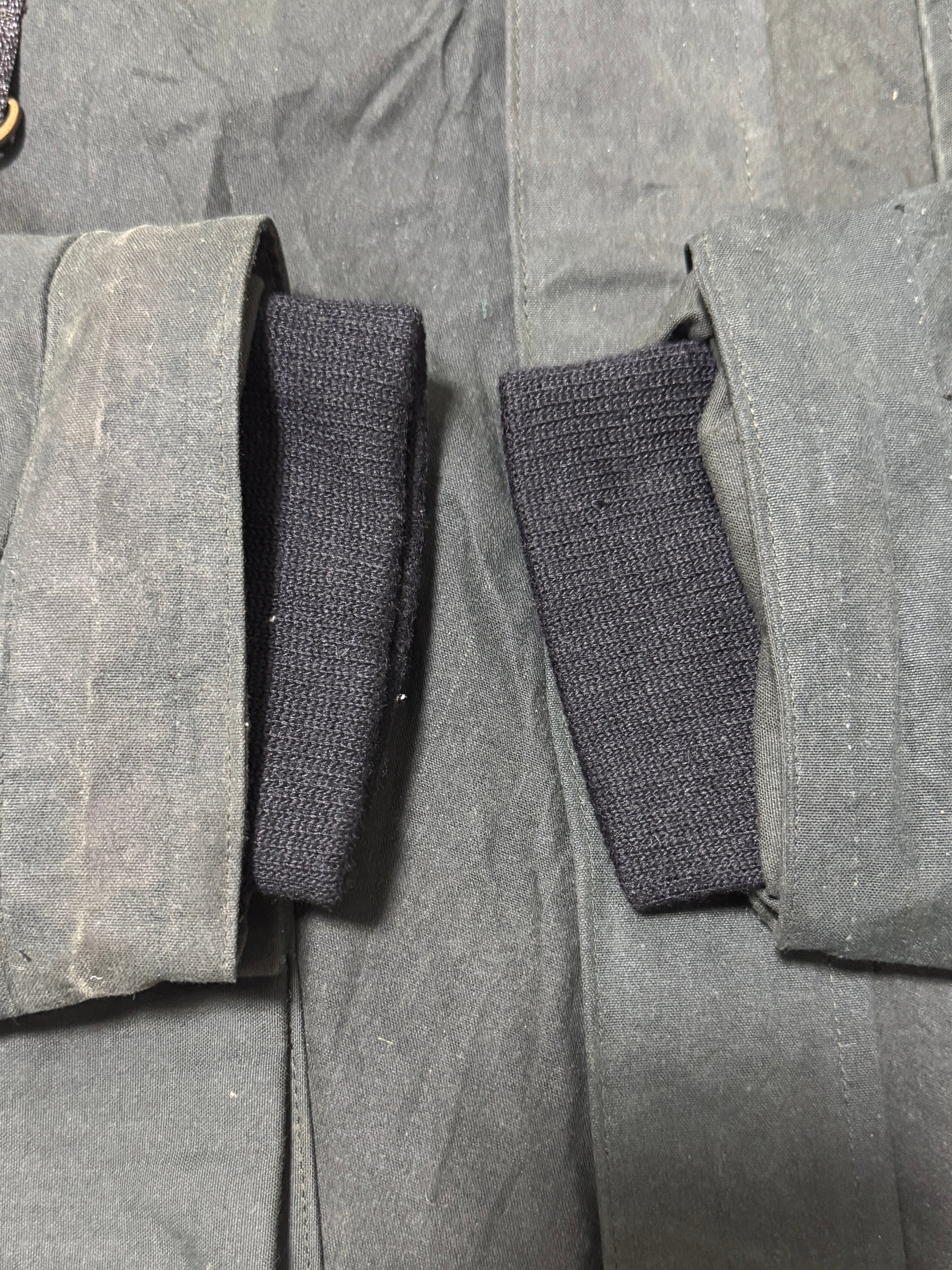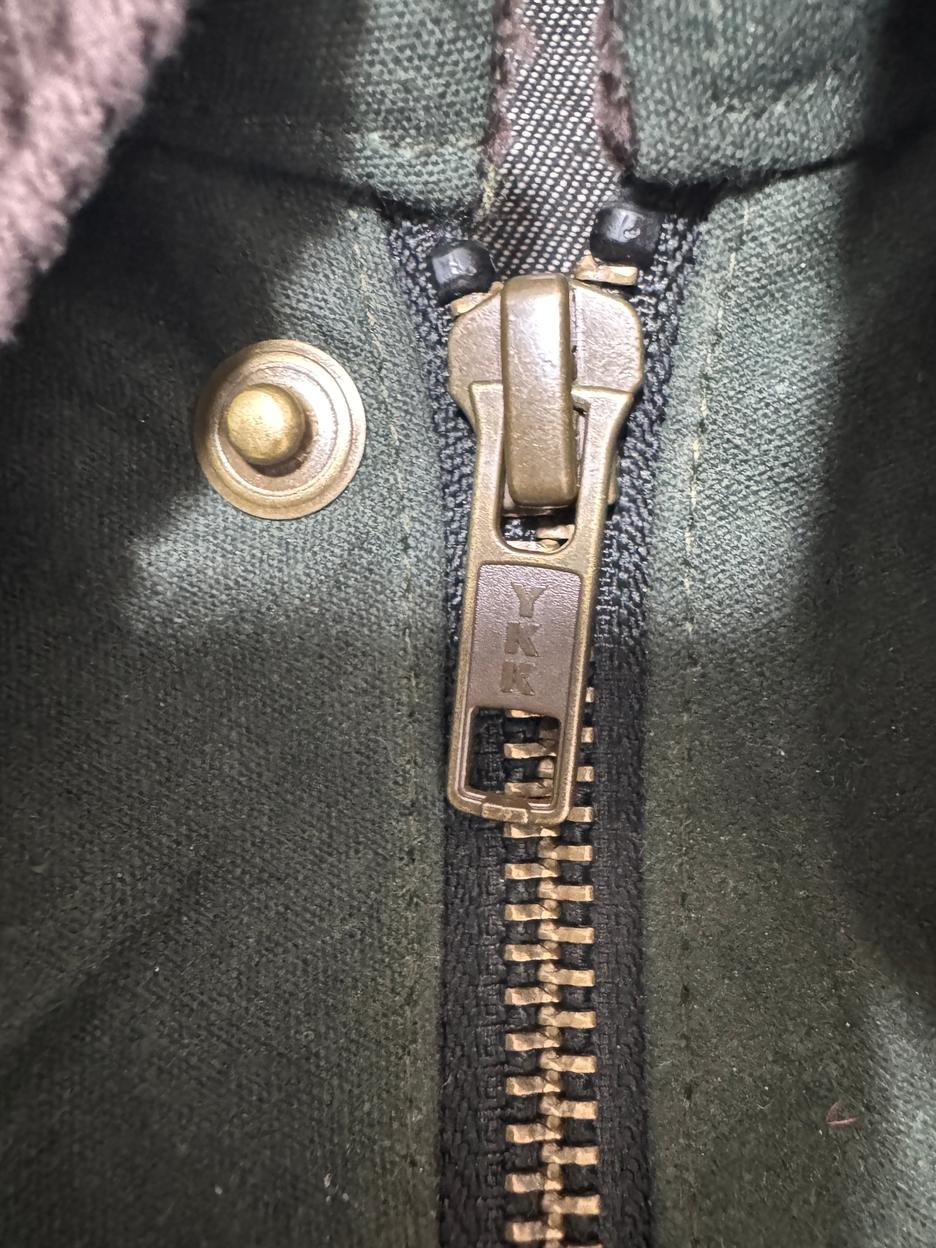 古着のオイルドジャケットを解体し再構築したリメイクフィッシングジャケットです。1枚作るのにジャケットを約2枚使う贅沢な作りです。機能的にも凝っており、サイドに貫通式のゲームポケット(両サイドにジッパーがつきます)、また、胸元にはDリングも付属します。さらに表地と裏地の間にもナイロン生地を挟み防寒性、防水性に優れた1着です。サイズは1 (M). 2 (L)の2サイズ、こちらはサイズ2になります。カラーはSAGE(オリーブ)になります。着画は170cmのものがサイズ1を使用、ゆとりのある作りです。