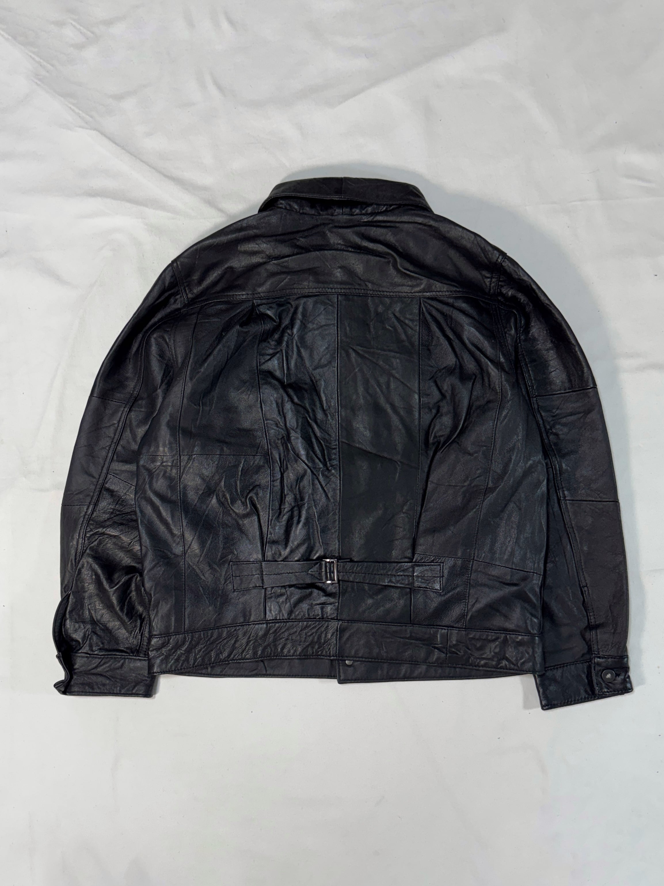 1stタイプ、シンチバック付きのレザー再構築ジャケットです。こちらはフロントボタン、シンチバックにブラックニッケルを使用したオールブラックモデルです(サイズ、ディテールはシルバーボタンのものと同じです)。メインボディは古着の軽く柔らかなビンテージラムレザーを全面に使用しています。シルエットはややワイドでゆったりとしたシルエット、着丈もほんのわずかに長めにしてバランスをとっています。ディテールはバックに1stタイプ特有のシンチバックを採用、また着用時の利便性を考えハンドウォームポケットを装備しています。このポケットは1stタイプのイメージを損なわないよう、サイドシームに沿って開閉口を取り付けており、表からは分からない作りとなっています。尚、裏地は古着のネルシャツと黒のフランネルの組み合わせで同じものが一つとして無い個性を大切にした1枚です。
