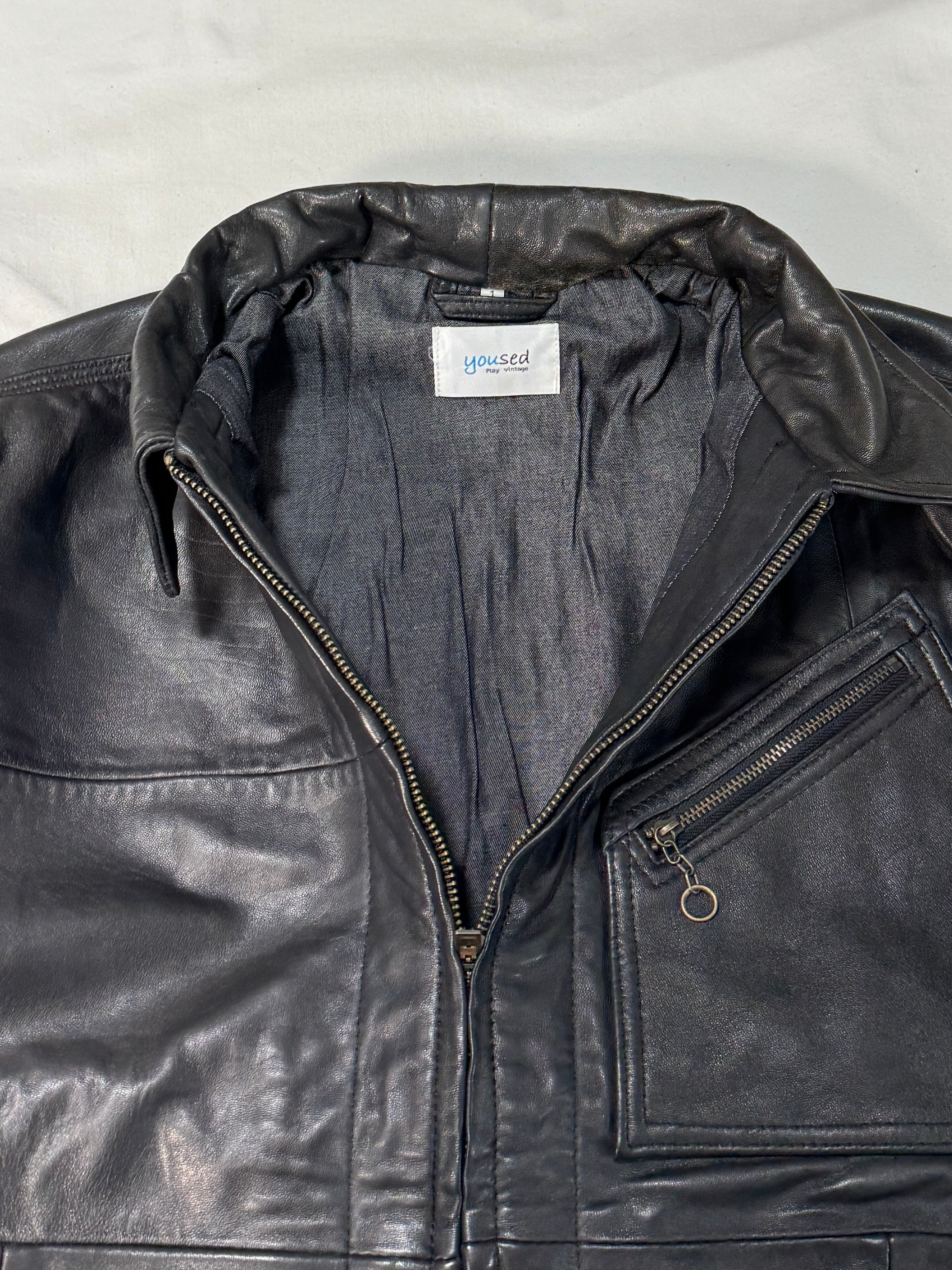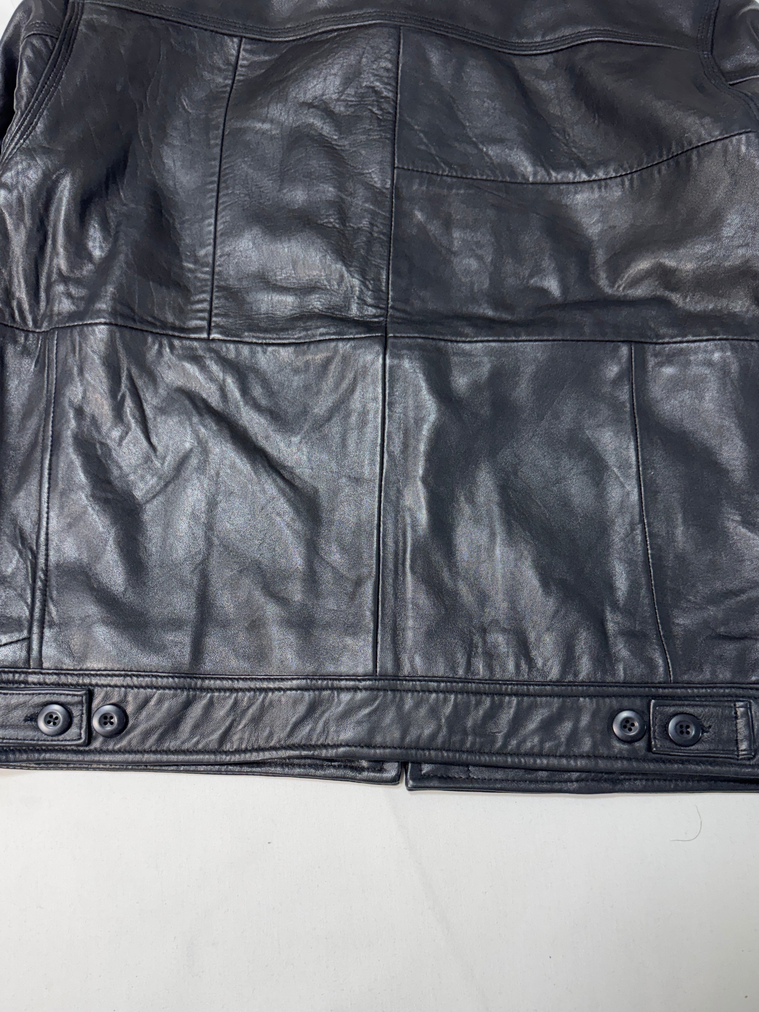 Leeの名作91Bワークウェアをサンプリングしレザーで再構築したリメイクウェアです。シルエットはスポーティなショート丈、胸元の斜めジップポケット、また両サイドの変形Dポケットが特徴です。袖はボタンカフス仕様、またウエストアジャスターが付属します。裏地はブラックシャンブレーを使用してます。近年ではオーバサイズのアウターが多い中、こちらはジャストに近いほどよく余裕のあるサイズ感で仕上げてあります。Leeの91bが発売されてから約80年経過しましたがどの時代でも不動の人気を誇った完成されたアーカイブモデルです。流行に左右されず長くご利用頂けること間違いなしの1枚と言えます