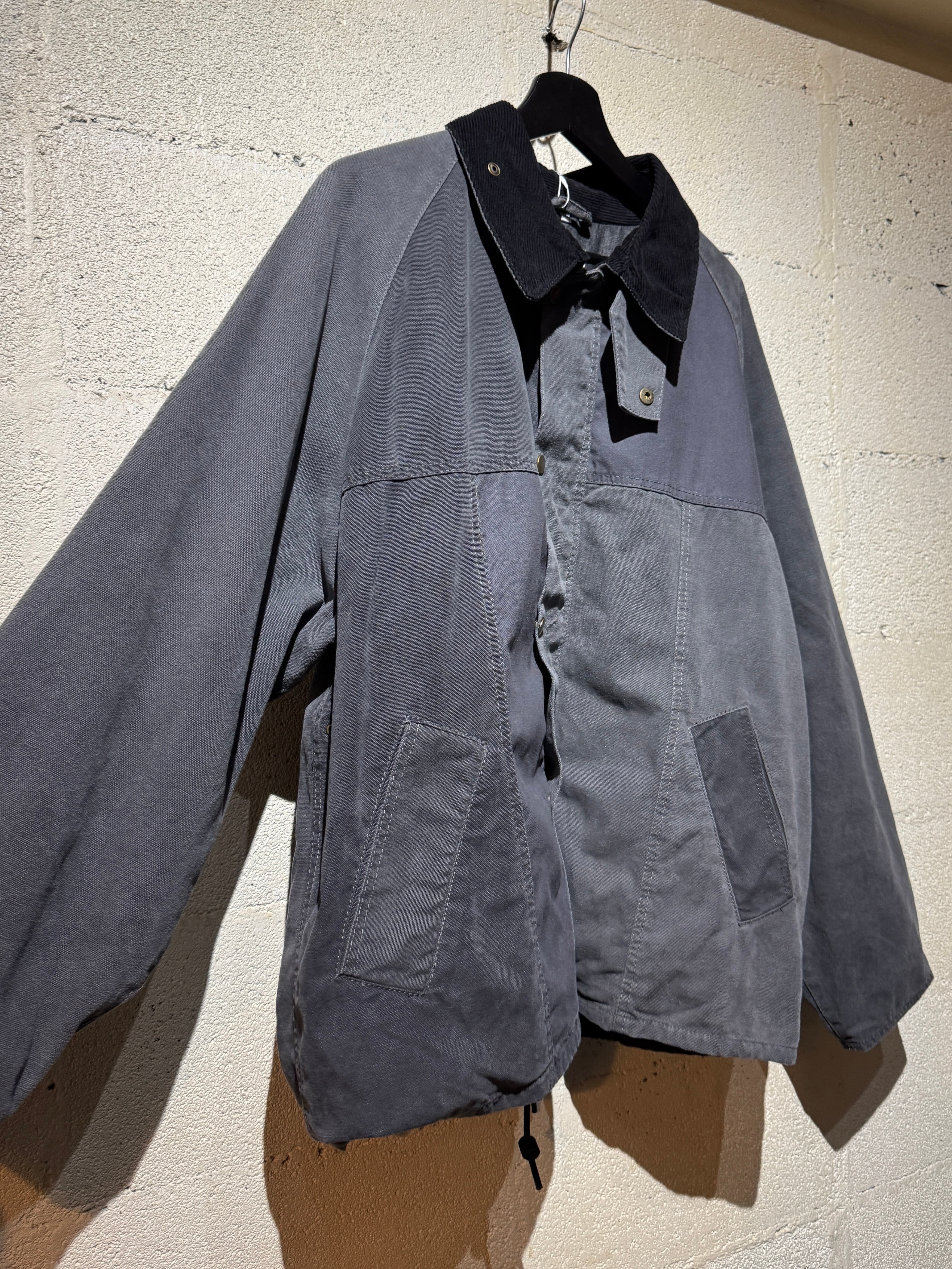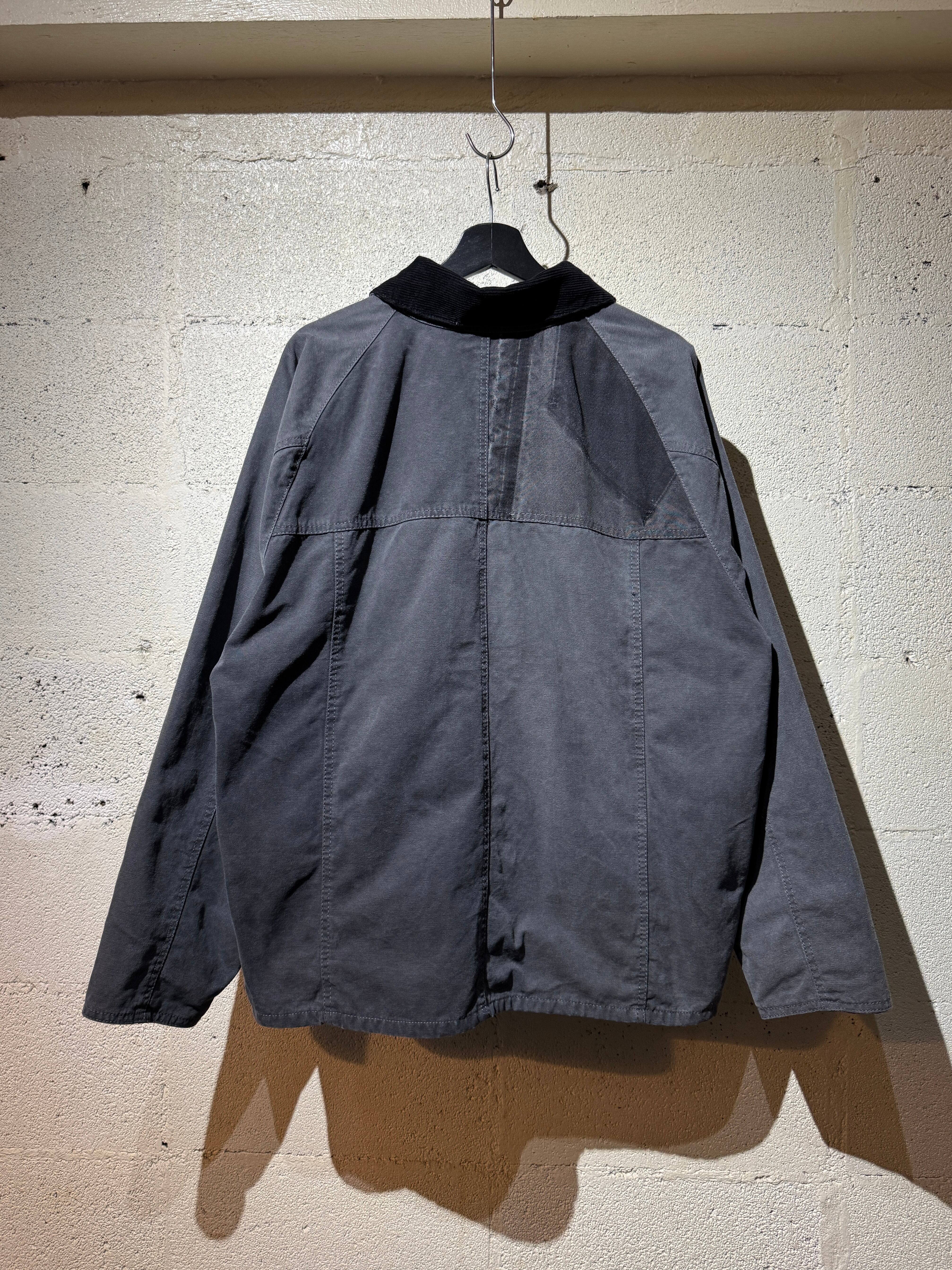 ダックジャケットで有名な某ワークブランドのパンツなどを解体し再構築したダック地のドライバーズジャケットです。yousedの定番レザードライバーズジャケットのダック地バージョンになります。身幅はややワイドめ、また着丈はショートのBOXシルエットのフォルムになります。襟はコーデュロイのチンストラップ付き、フロントはスナップボタンとジッパーの組み合わせです。裏地もそう古くはありませんが長く使用されず保管されたデッドストックのシャンブレーブラックを使用してあります。また袖内は二重構造のスナップ付きで風が入るのを防ぐ仕様です。余計なディテールは排除されたスタンダードなモデルですがシルエットに特に気を配った着回しのきくyousedのロングセラーモデルです。