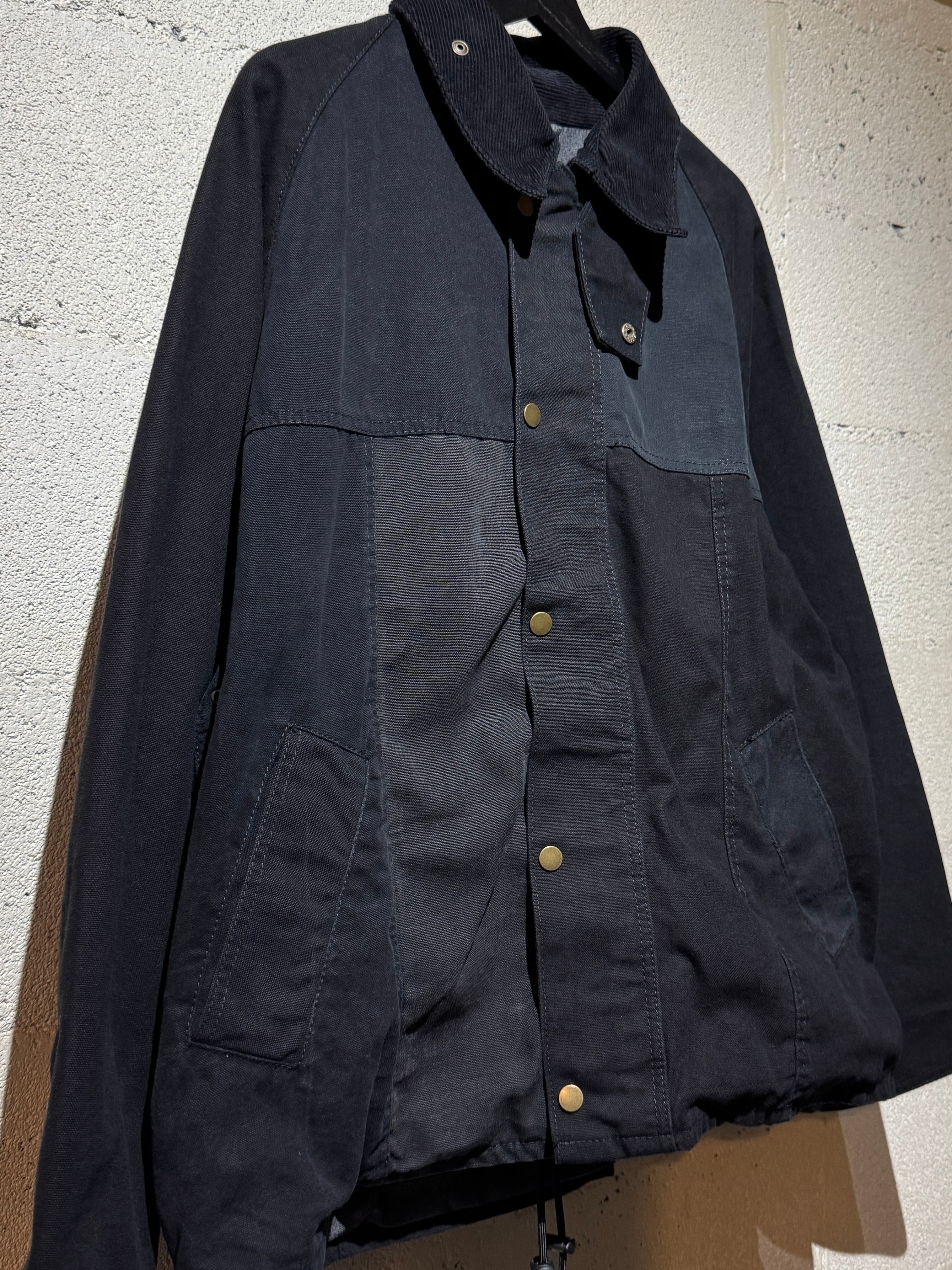 ダックジャケットで有名な某ワークブランドのパンツなどを解体し再構築したダック地のドライバーズジャケットです。yousedの定番レザードライバーズジャケットのダック地バージョンになります。身幅はややワイドめ、また着丈はショートのBOXシルエットのフォルムになります。襟はコーデュロイのチンストラップ付き、フロントはスナップボタンとジッパーの組み合わせです。裏地もそう古くはありませんが長く使用されず保管されたデッドストックのシャンブレーブラックを使用してあります。また袖内は二重構造のスナップ付きで風が入るのを防ぐ仕様です。余計なディテールは排除されたスタンダードなモデルですがシルエットに特に気を配った着回しのきくyousedのロングセラーモデルです。