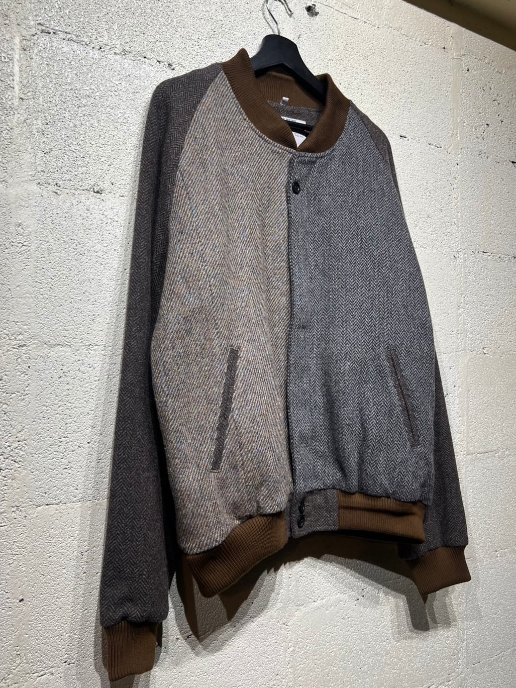 古着のハリスツイードを解体し再構築したダービージャケットです。ダービージャケットは1960〜80年代にアメリカの西海岸のスケーターなどに愛されたストリートファッションのアウターでラグランスリーブの作り、またショート丈のリブ仕様が特徴です。yousedではこのダービージャケットをハリスツイード生地を用いて再構築しました。ストリートなシルエットにブリティッシュな雰囲気を加え大人のカジュアルを演出してくれます。尚、古着のハリスツイードを使用してますので柄や組み合わせの同じものが存在しない「個性」を大切にしたリメイクウェアとなっています