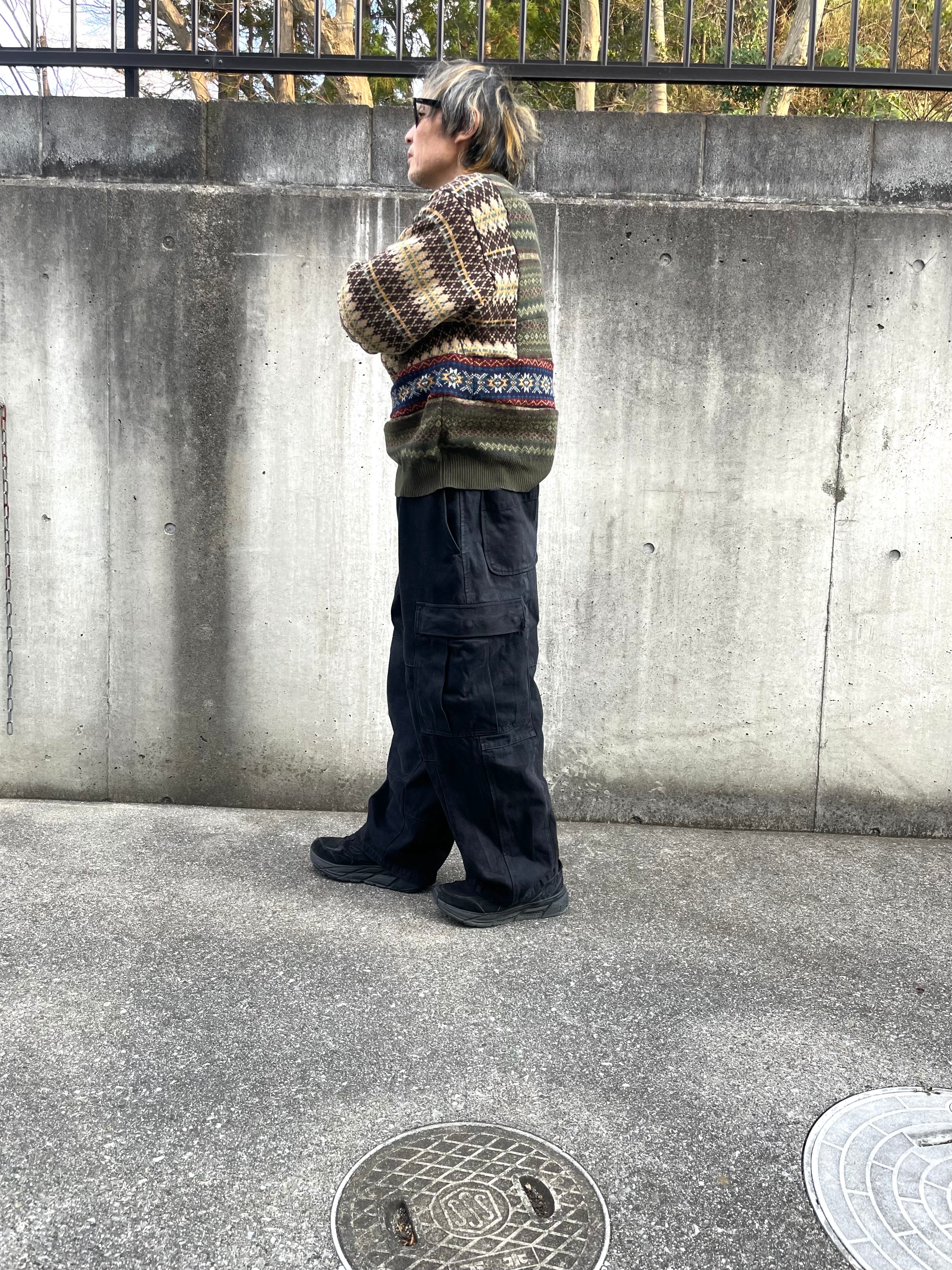 ワタリ約37cm、裾幅25cmの大胆なワイド設計に加え、股上は39cmと深め。