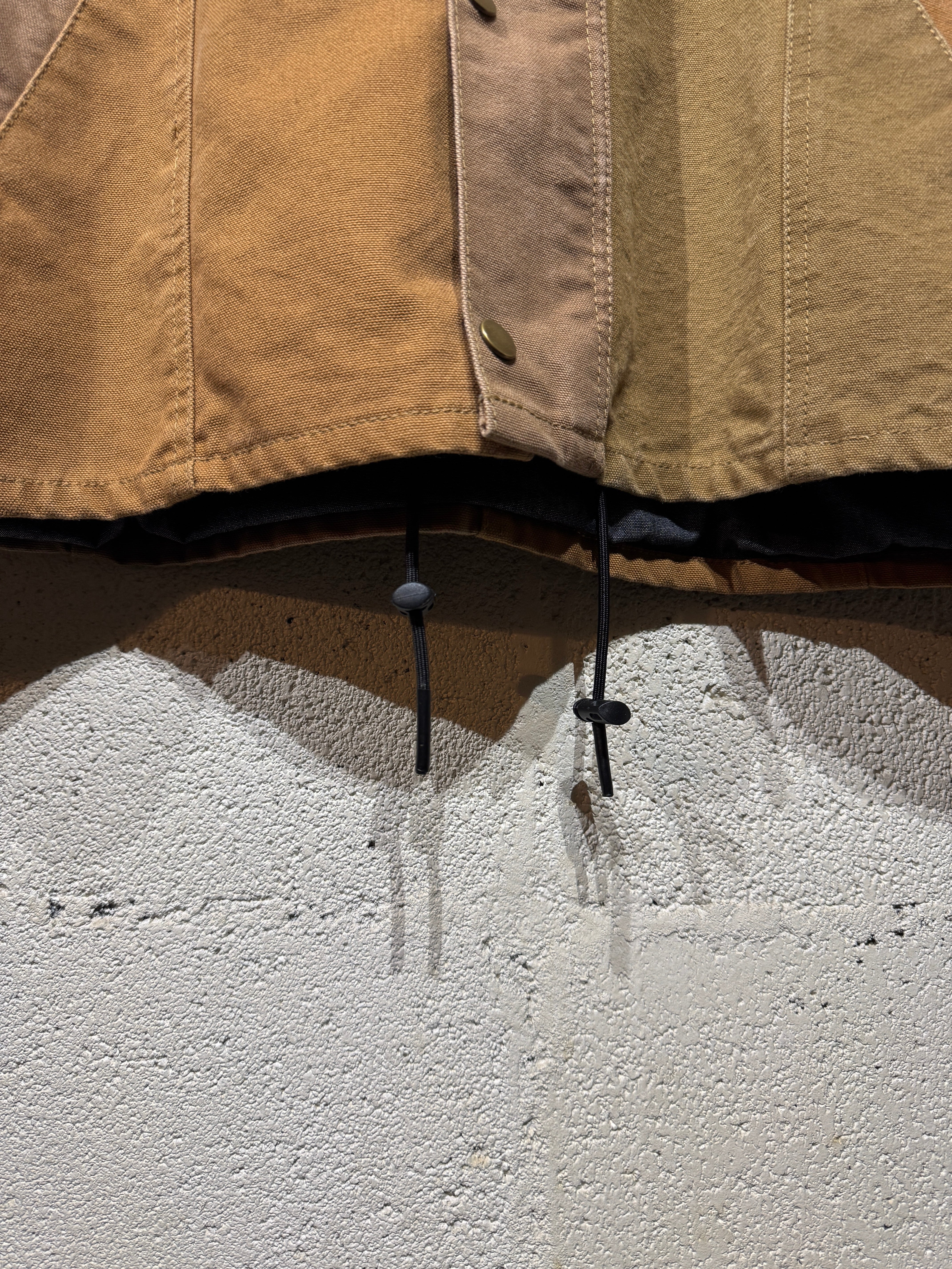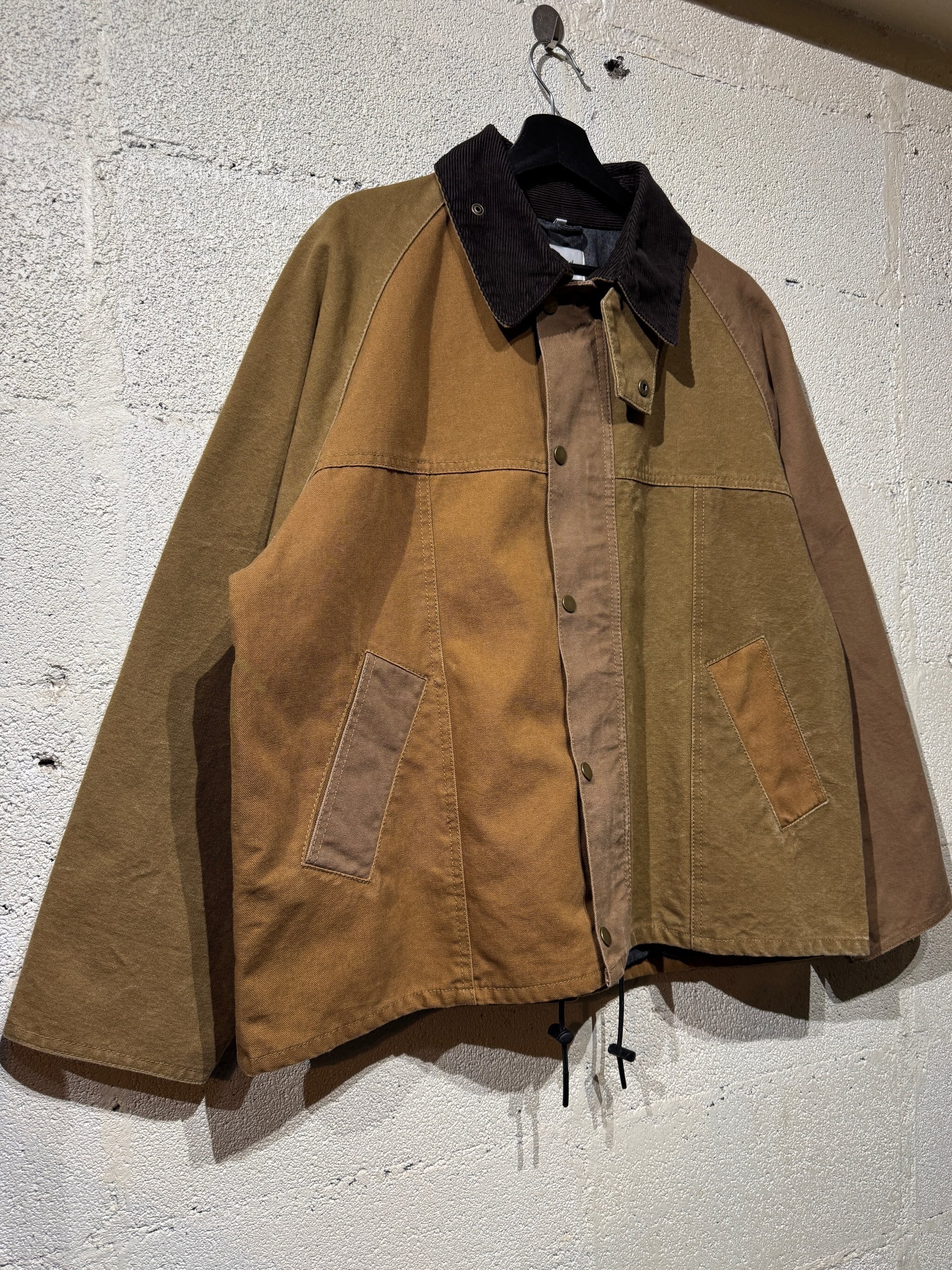 ダックジャケットで有名な某ワークブランドのパンツなどを解体し再構築したダック地のドライバーズジャケットです。yousedの定番レザードライバーズジャケットのダック地バージョンになります。身幅はややワイドめ、また着丈はショートのBOXシルエットのフォルムになります。襟はコーデュロイのチンストラップ付き、フロントはスナップボタンとジッパーの組み合わせです。裏地もそう古くはありませんが長く使用されず保管されたデッドストックのシャンブレーブラックを使用してあります。また袖内は二重構造のスナップ付きで風が入るのを防ぐ仕様です。余計なディテールは排除されたスタンダードなモデルですがシルエットに特に気を配った着回しのきくyousedのロングセラーモデルです。