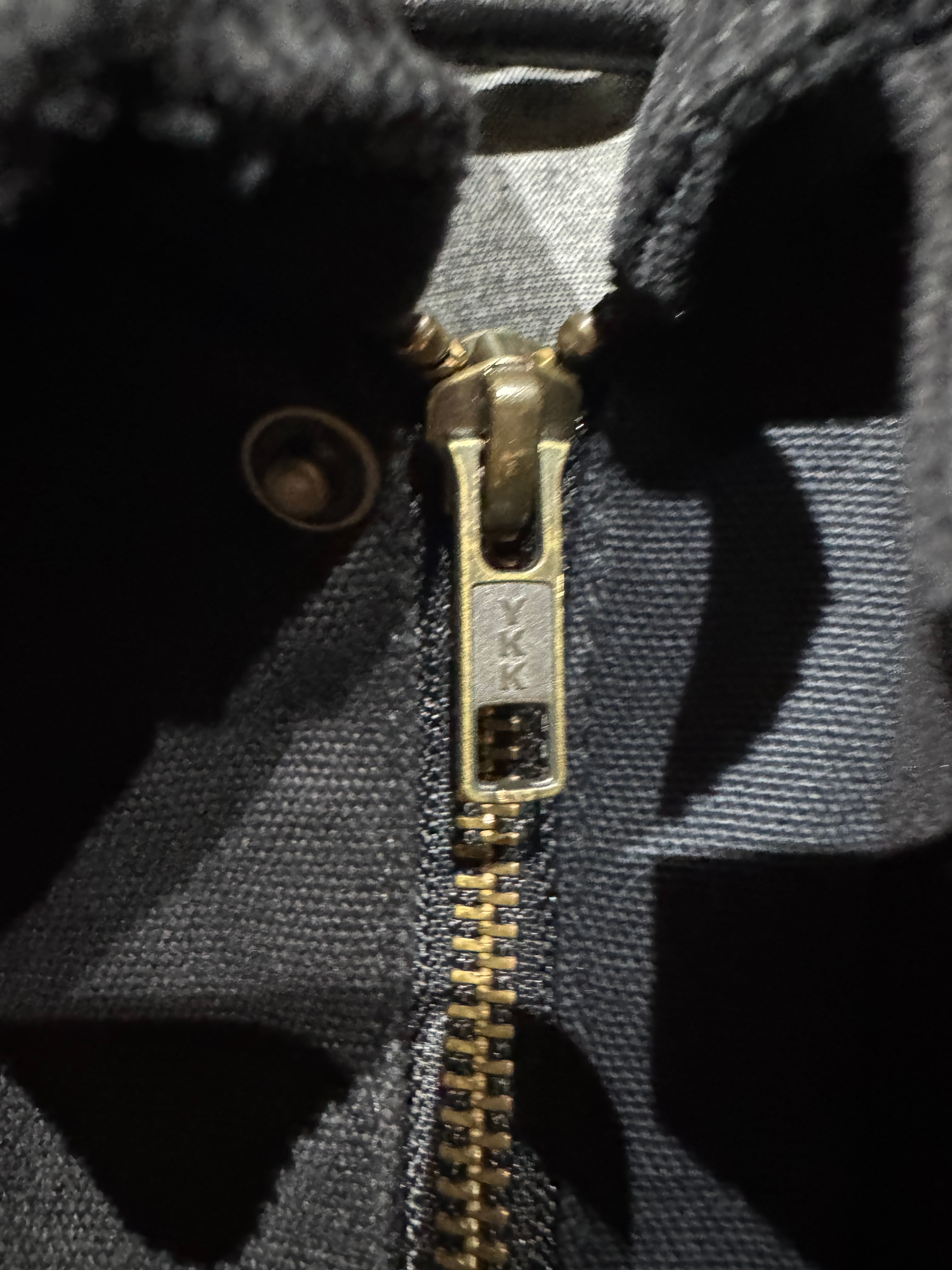 ダックジャケットで有名な某ワークブランドのパンツなどを解体し再構築したダック地のドライバーズジャケットです。yousedの定番レザードライバーズジャケットのダック地バージョンになります。身幅はややワイドめ、また着丈はショートのBOXシルエットのフォルムになります。襟はコーデュロイのチンストラップ付き、フロントはスナップボタンとジッパーの組み合わせです。裏地もそう古くはありませんが長く使用されず保管されたデッドストックのシャンブレーブラックを使用してあります。また袖内は二重構造のスナップ付きで風が入るのを防ぐ仕様です。余計なディテールは排除されたスタンダードなモデルですがシルエットに特に気を配った着回しのきくyousedのロングセラーモデルです。