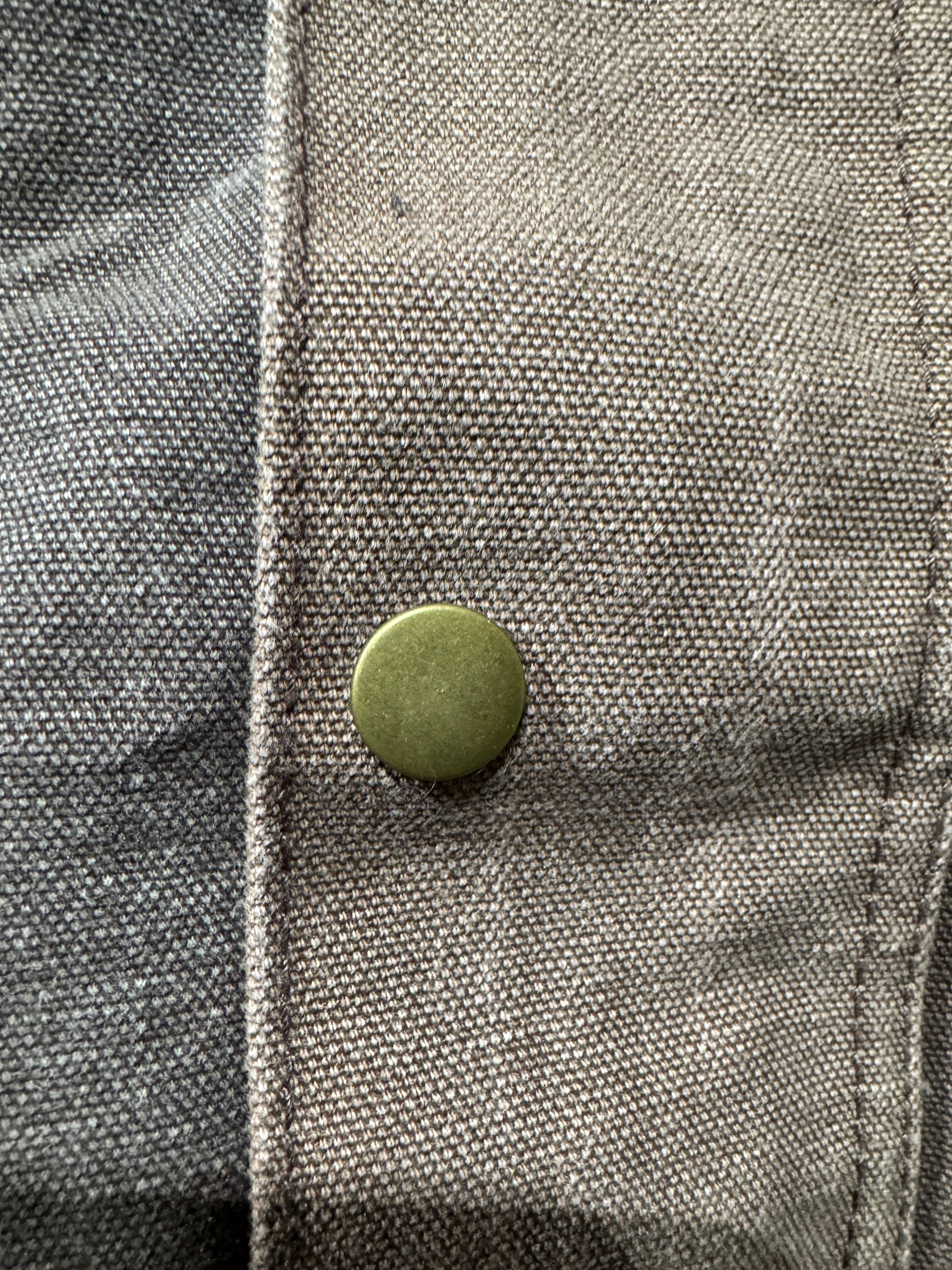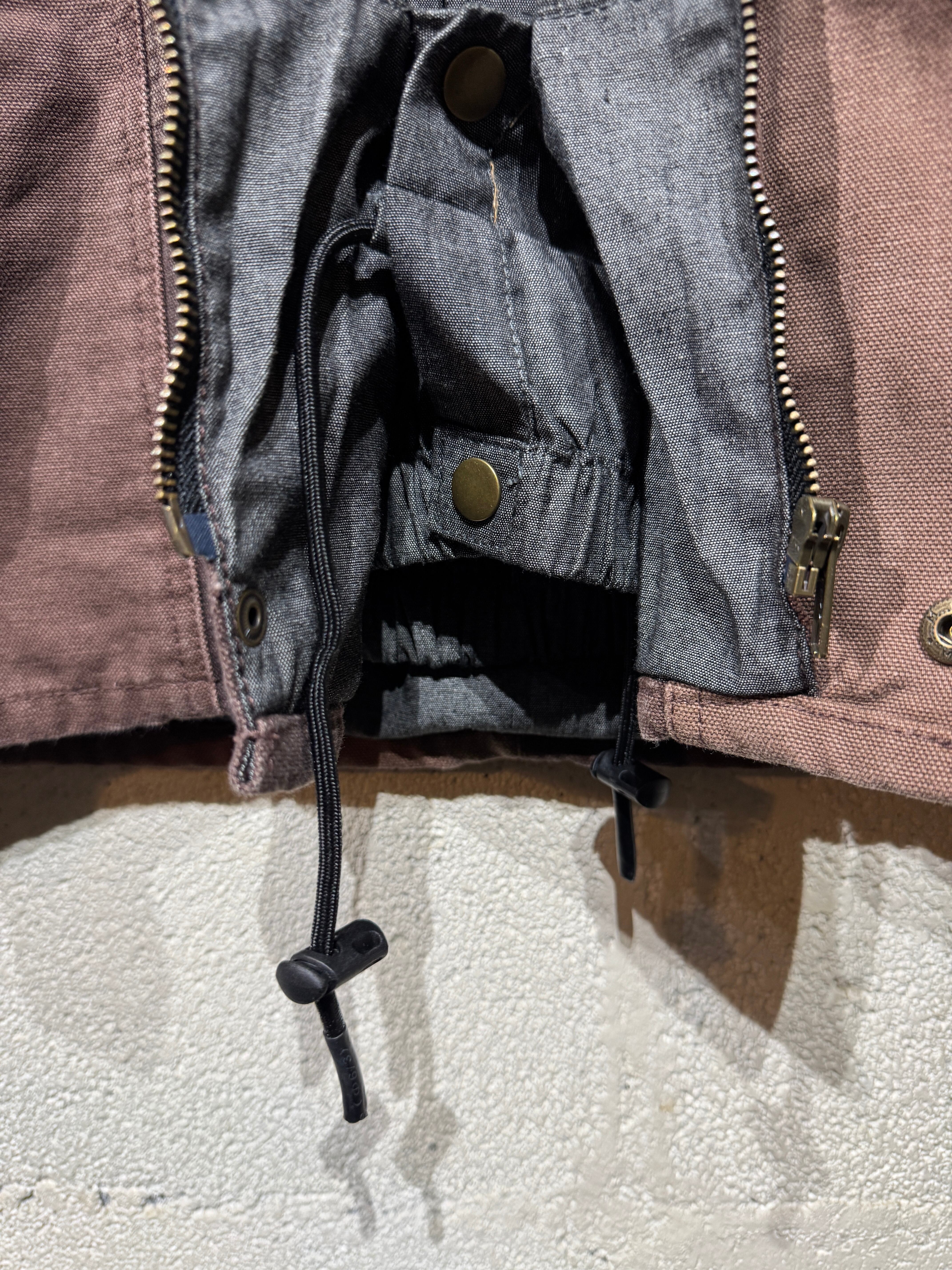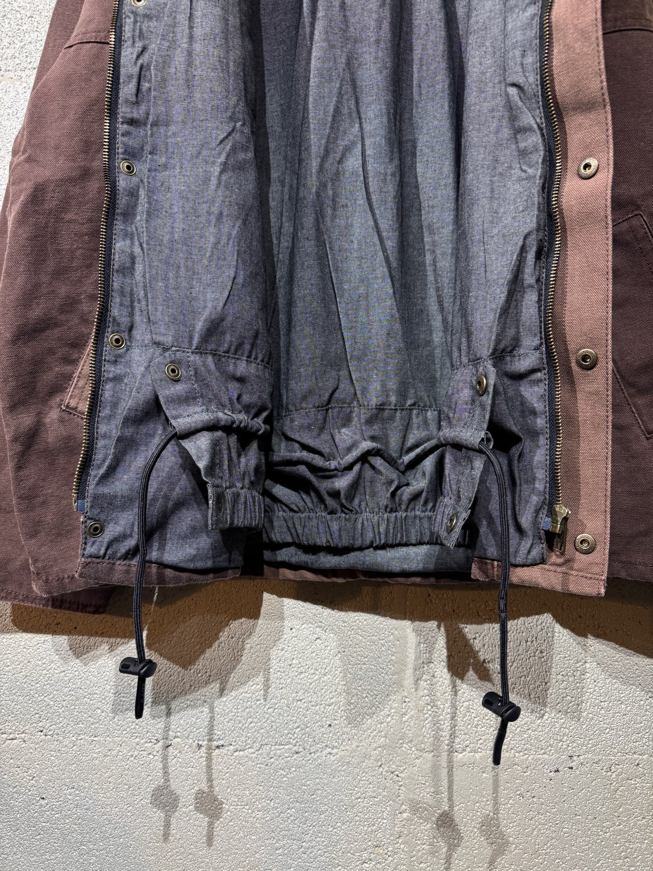 ダックジャケットで有名な某ワークブランドのパンツなどを解体し再構築したダック地のドライバーズジャケットです。yousedの定番レザードライバーズジャケットのダック地バージョンになります。身幅はややワイドめ、また着丈はショートのBOXシルエットのフォルムになります。襟はコーデュロイのチンストラップ付き、フロントはスナップボタンとジッパーの組み合わせです。裏地もそう古くはありませんが長く使用されず保管されたデッドストックのシャンブレーブラックを使用してあります。また袖内は二重構造のスナップ付きで風が入るのを防ぐ仕様です。余計なディテールは排除されたスタンダードなモデルですがシルエットに特に気を配った着回しのきくyousedのロングセラーモデルです。