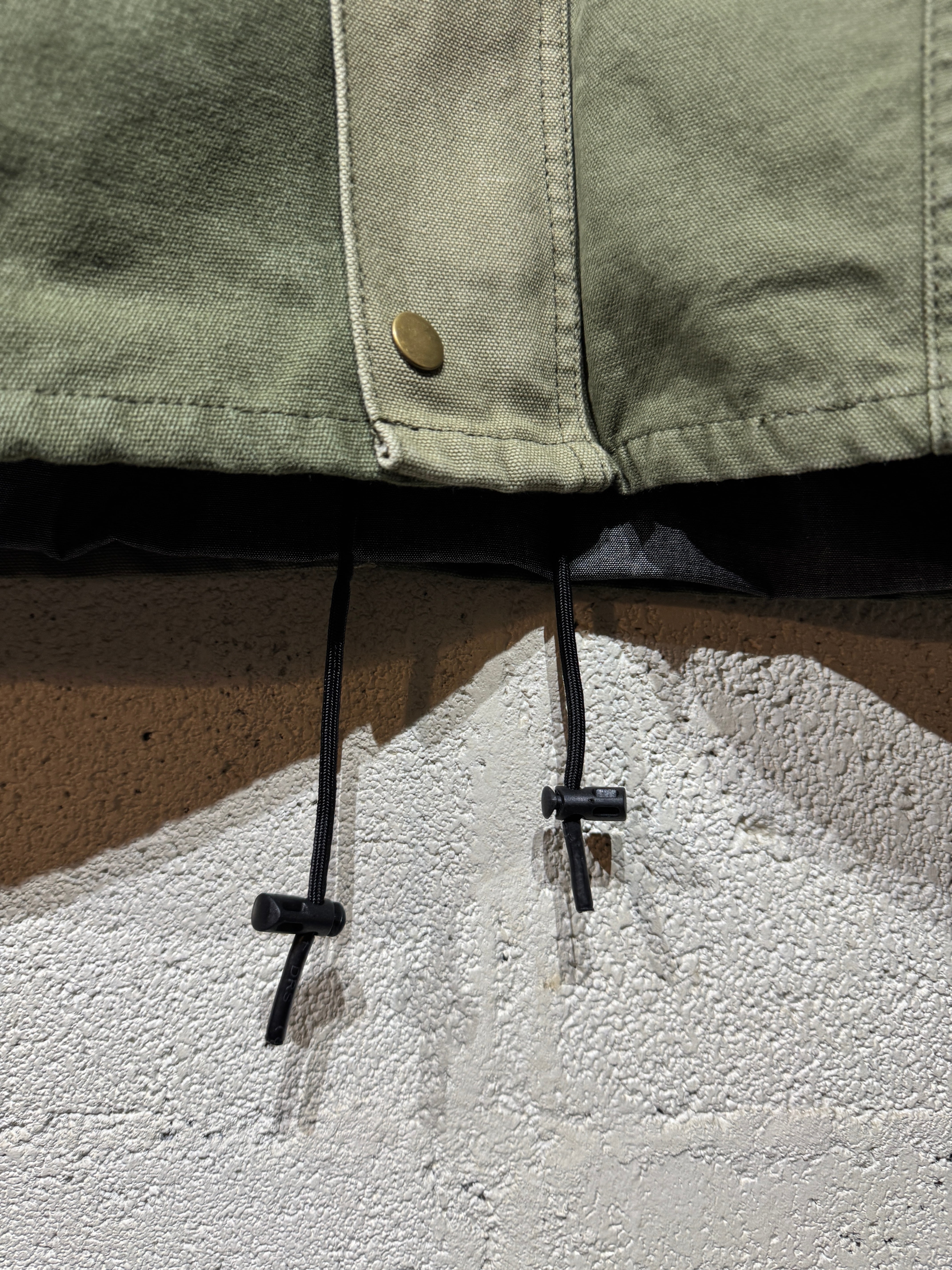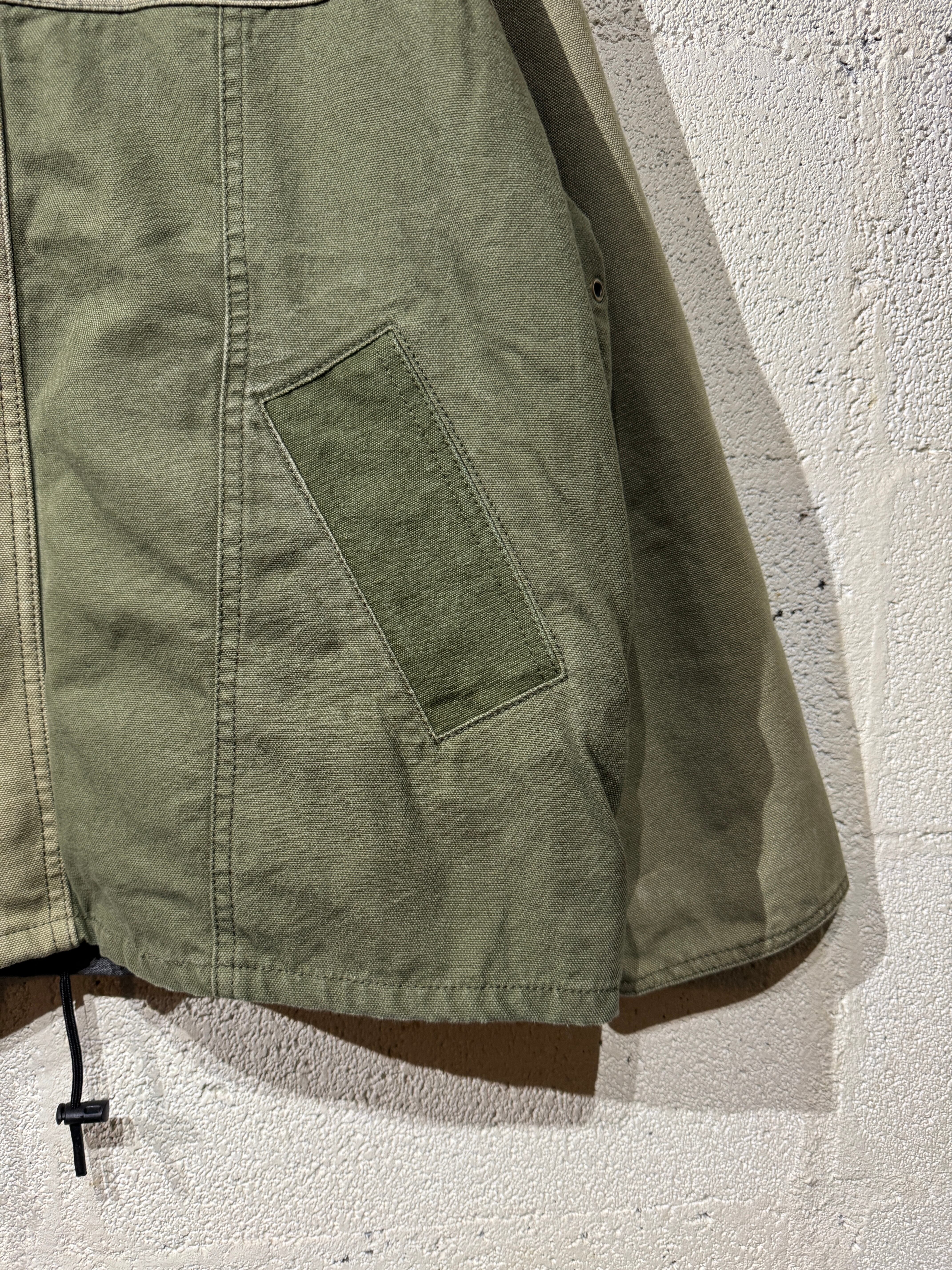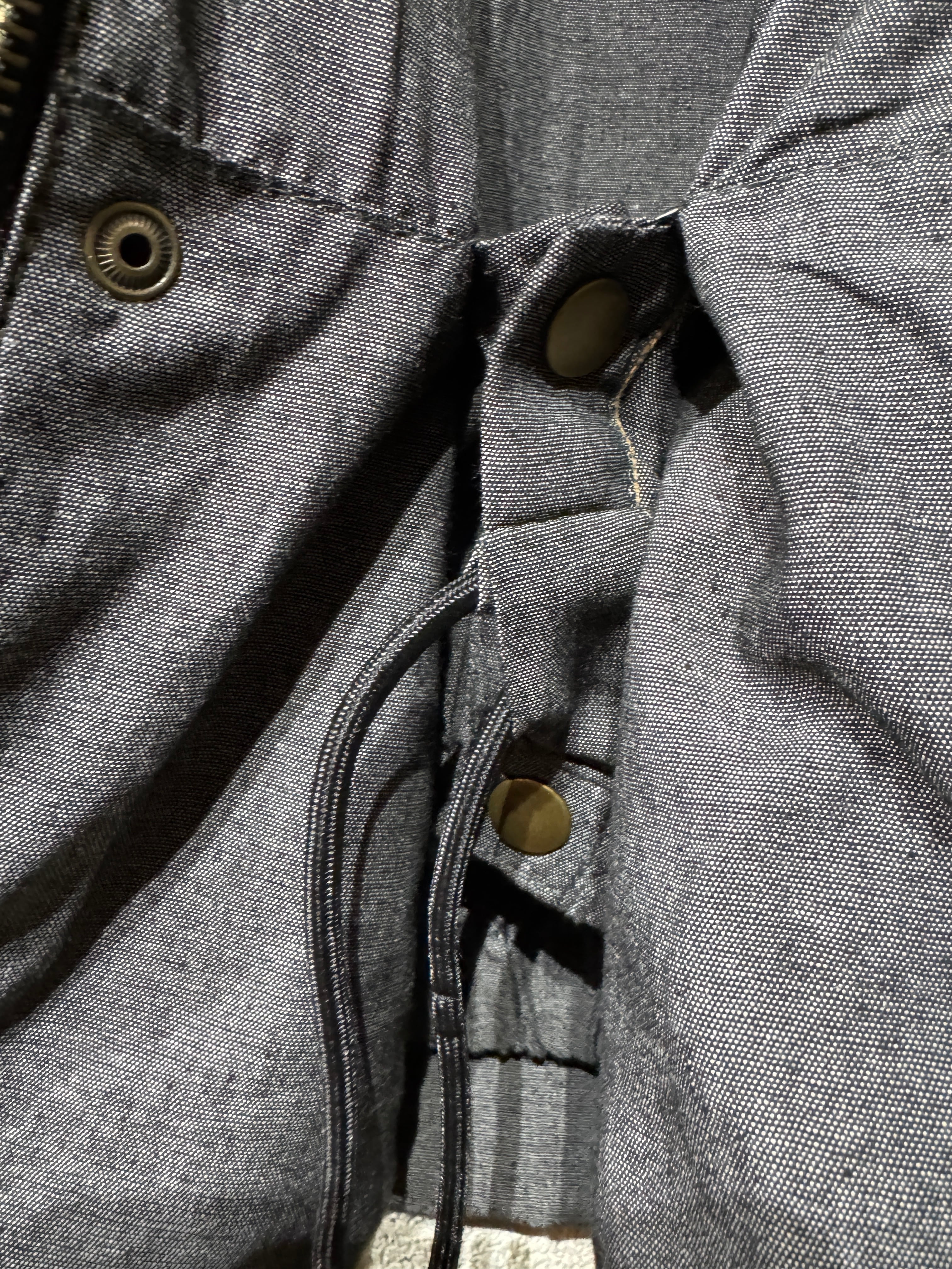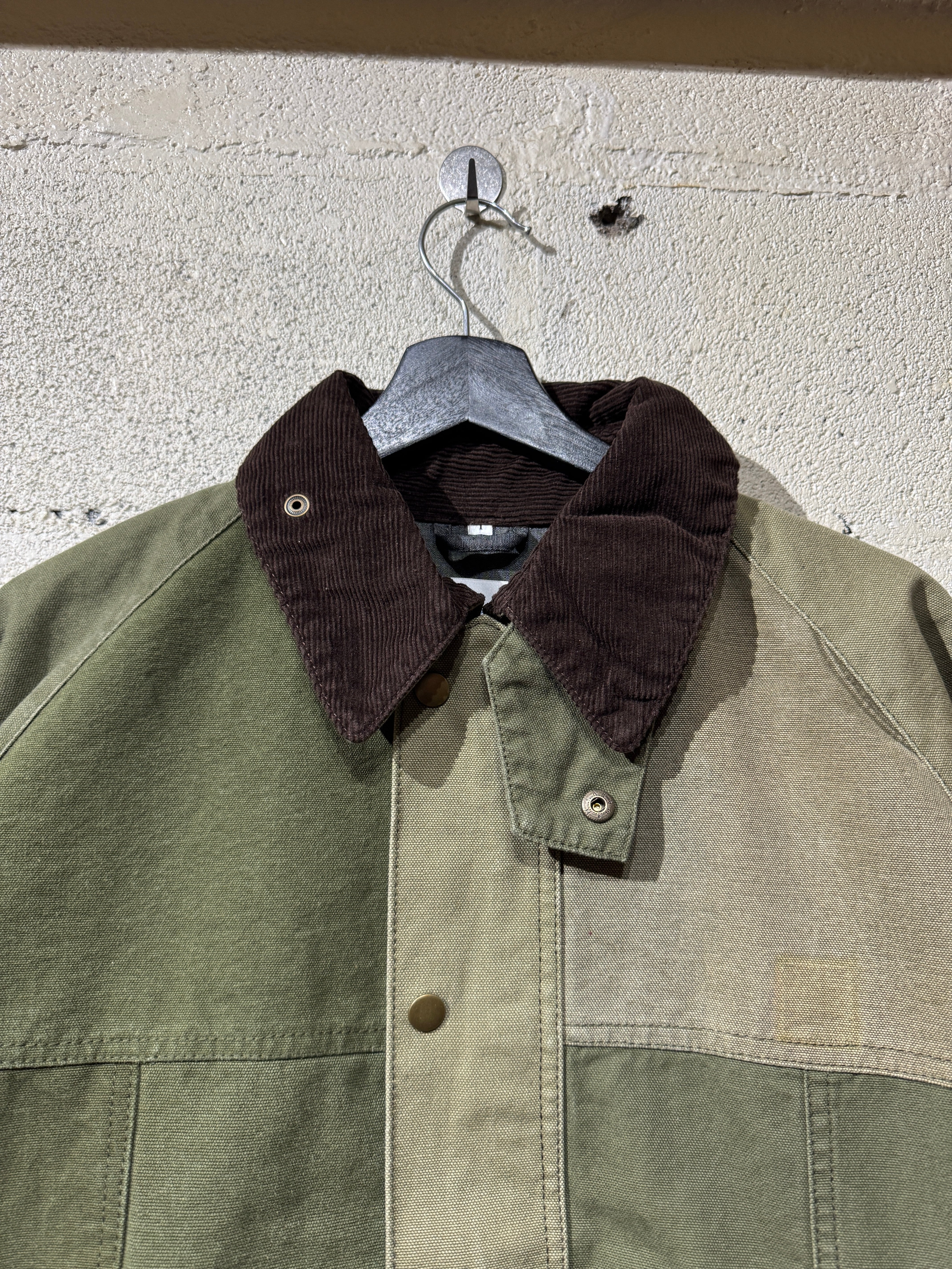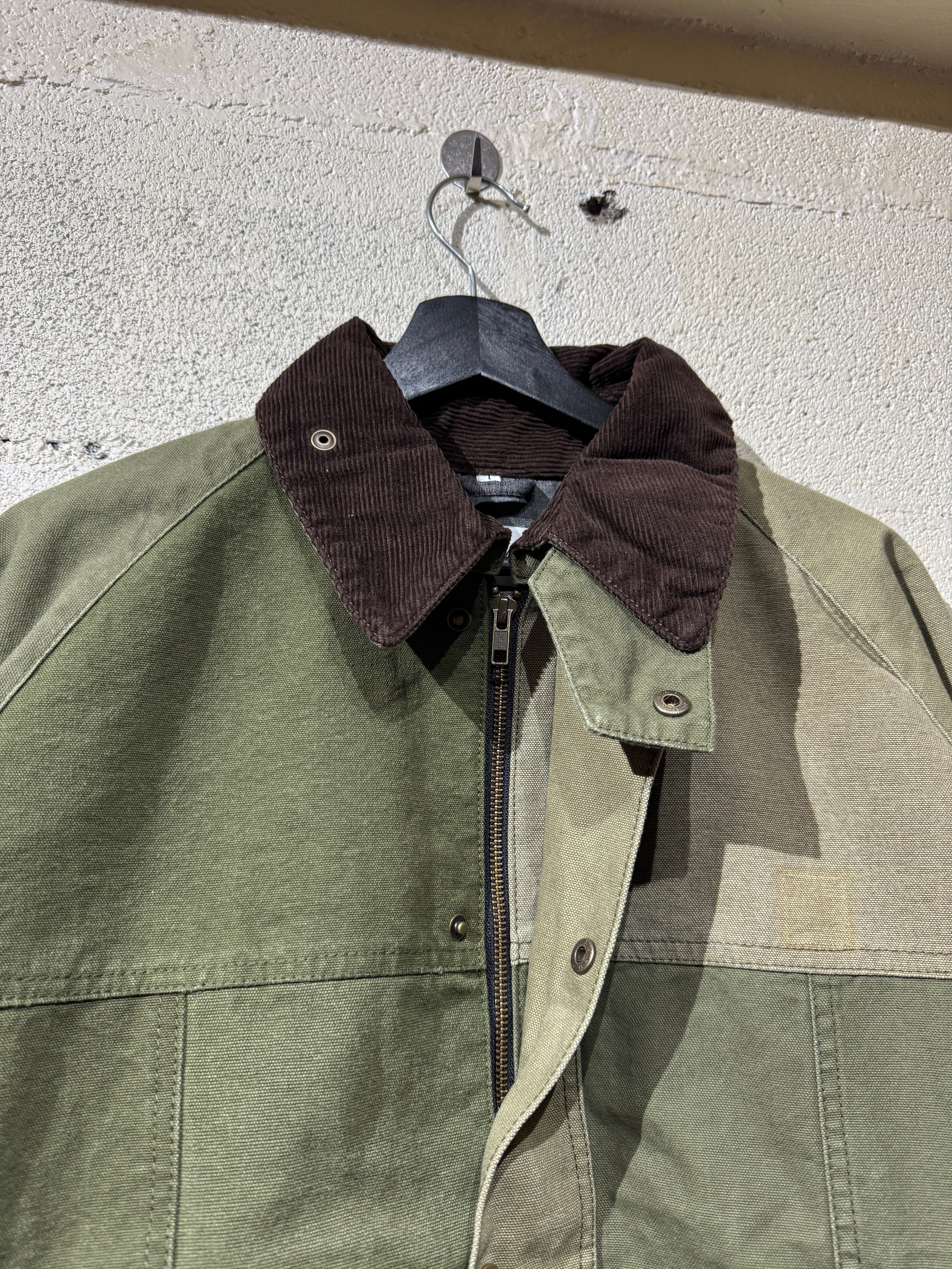 ダックジャケットで有名な某ワークブランドのパンツなどを解体し再構築したダック地のドライバーズジャケットです。yousedの定番レザードライバーズジャケットのダック地バージョンになります。身幅はややワイドめ、また着丈はショートのBOXシルエットのフォルムになります。襟はコーデュロイのチンストラップ付き、フロントはスナップボタンとジッパーの組み合わせです。裏地もそう古くはありませんが長く使用されず保管されたデッドストックのシャンブレーブラックを使用してあります。また袖内は二重構造のスナップ付きで風が入るのを防ぐ仕様です。余計なディテールは排除されたスタンダードなモデルですがシルエットに特に気を配った着回しのきくyousedのロングセラーモデルです。