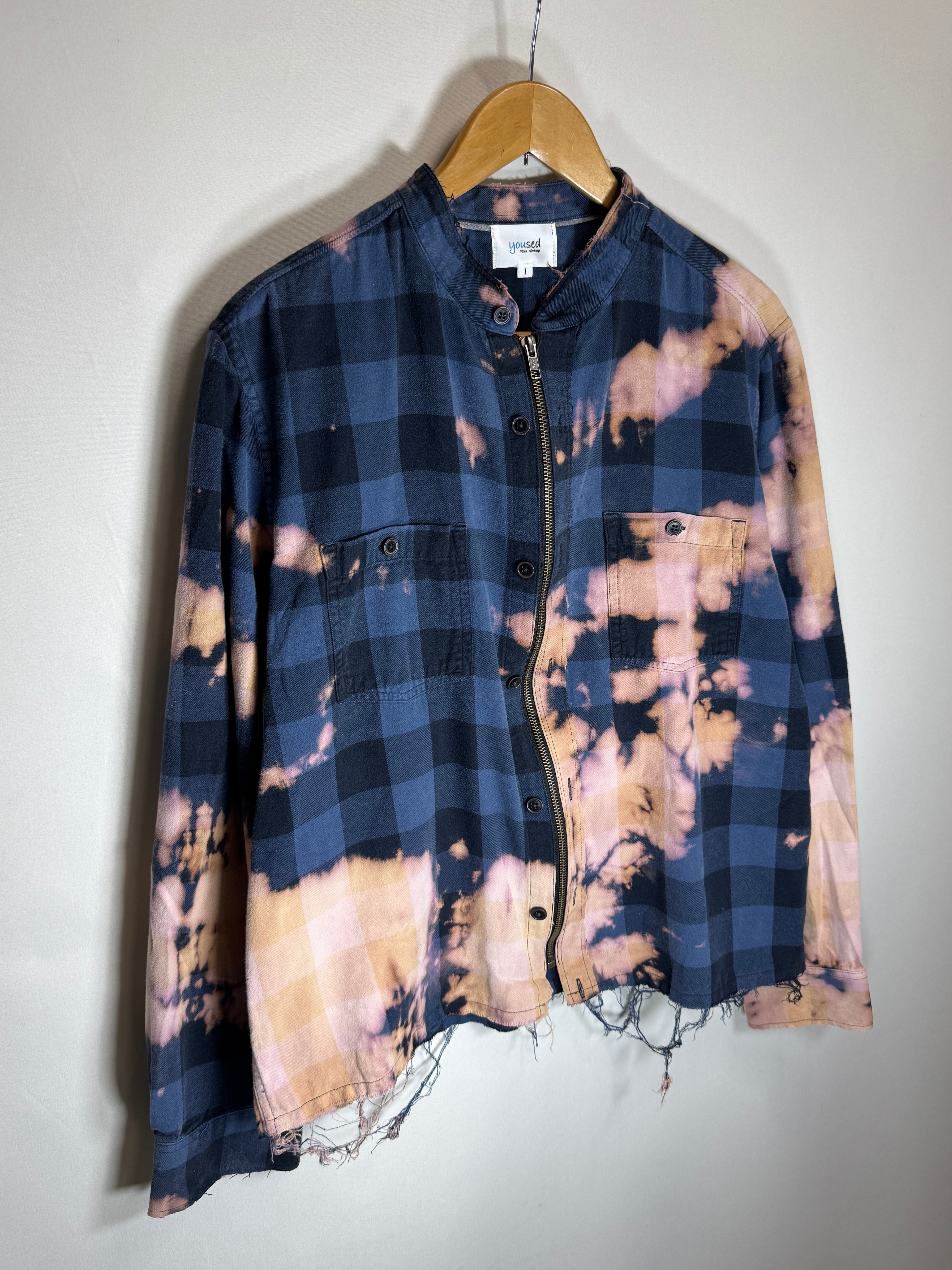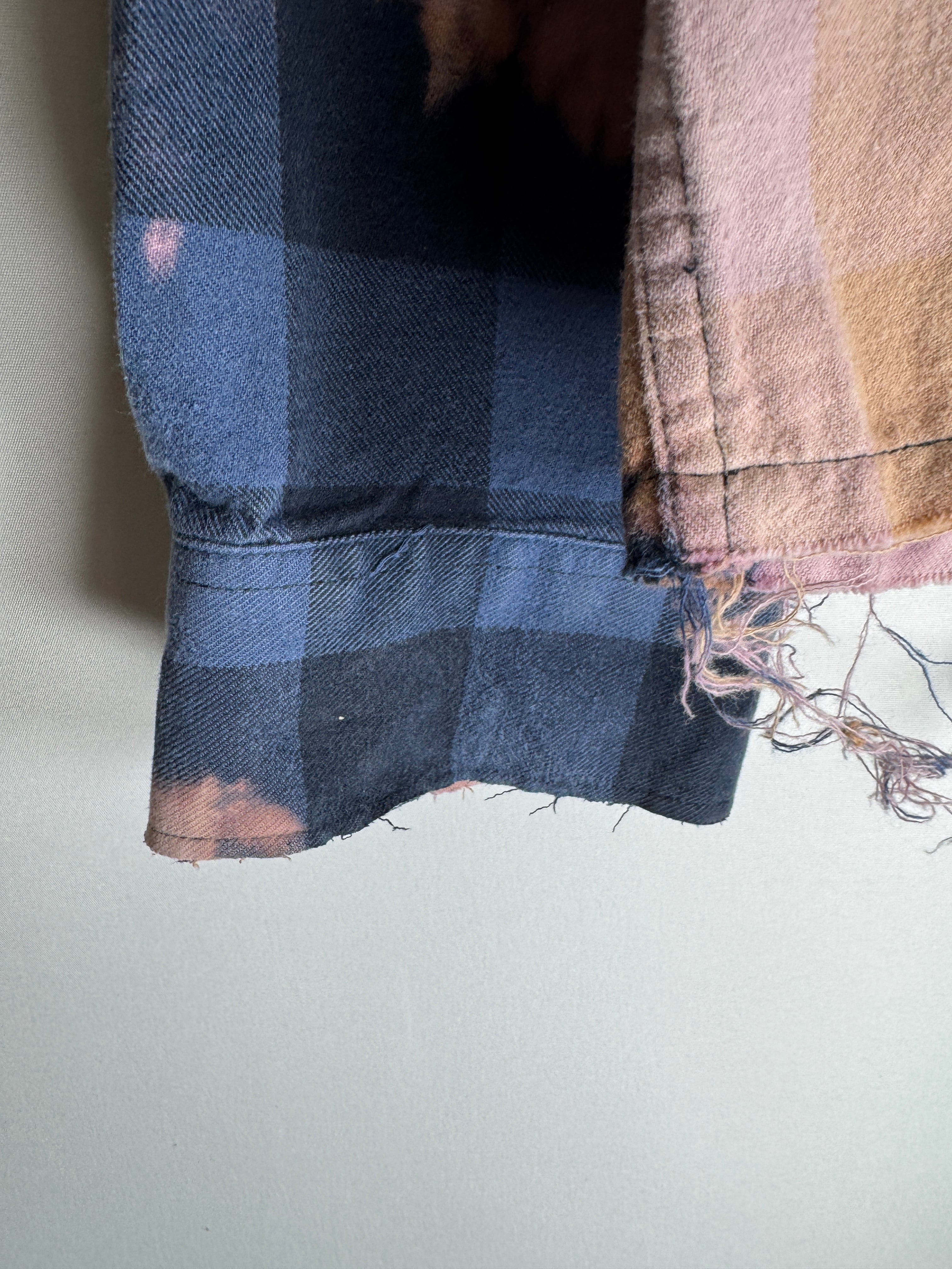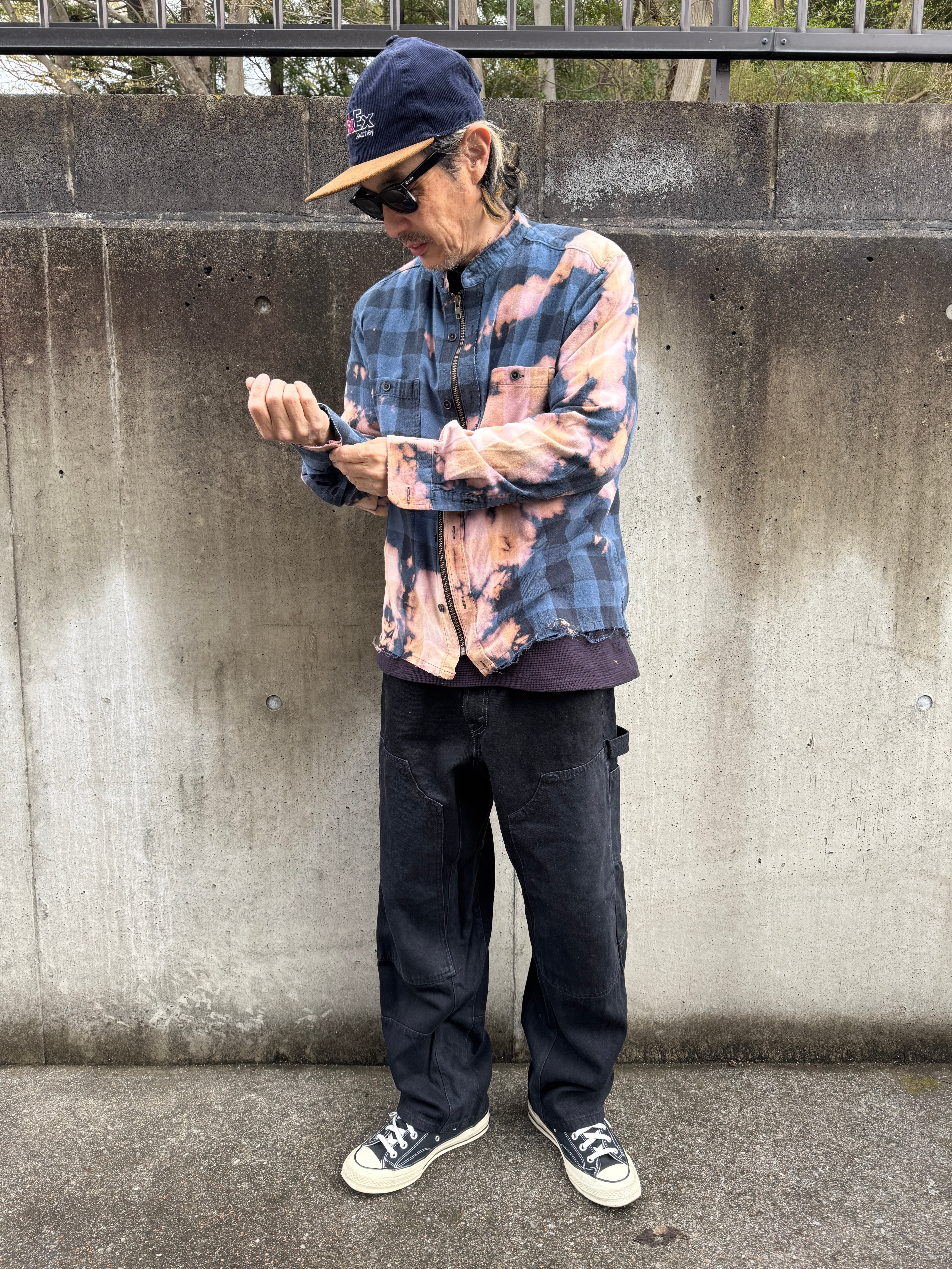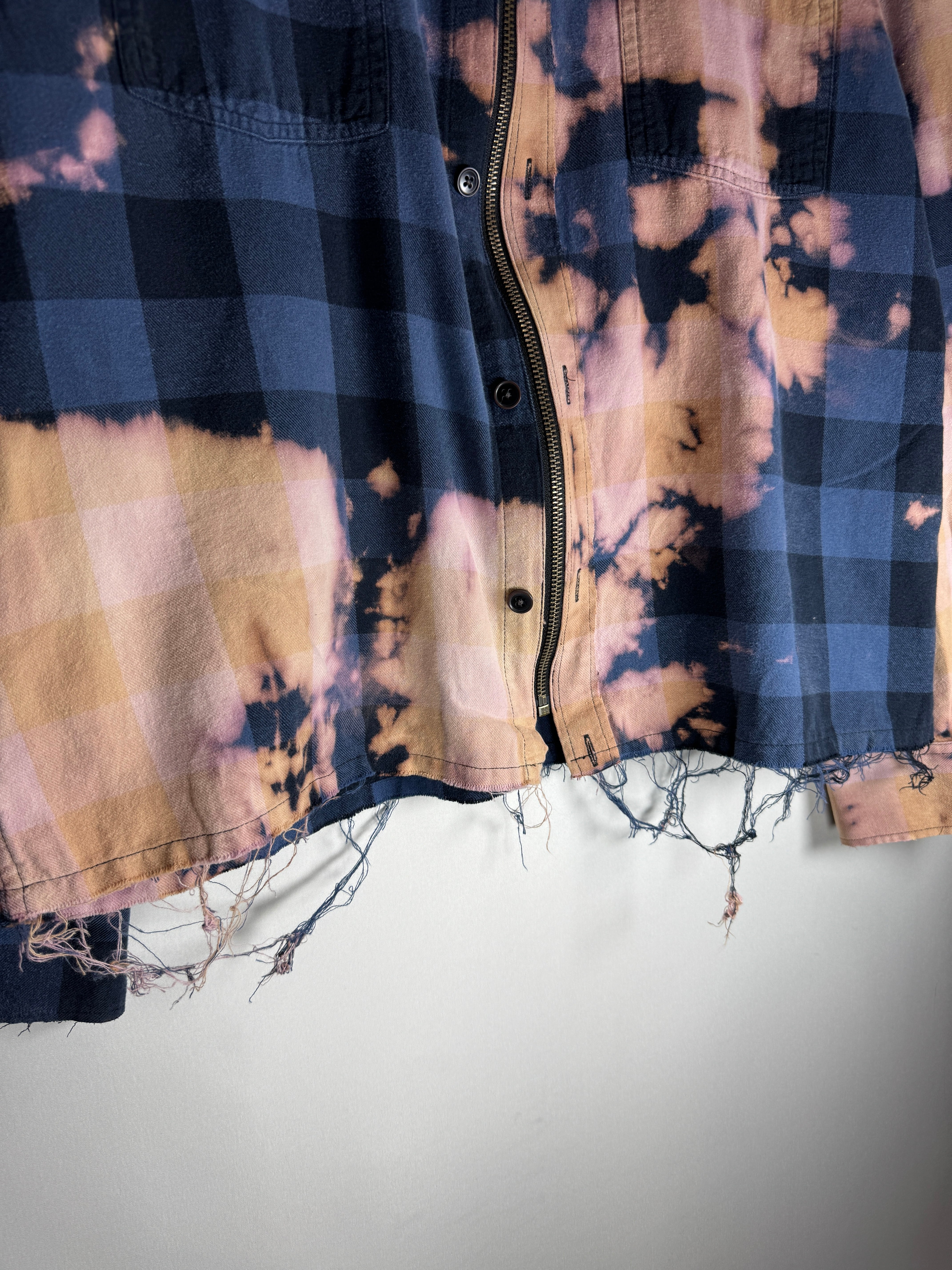 usedのネルシャツを特殊ブリーチし、前立てサイドにジッパーを付属した2wayのリメイクシャツです。襟、裾、前立て、袖端はすべてカットオフにしてグランジ感を出しています。ジッパーは全開閉しますのでシャツブルゾンの感覚で羽織って頂け、またボタンを留めて通常のシャツの感覚でもご利用頂けます。