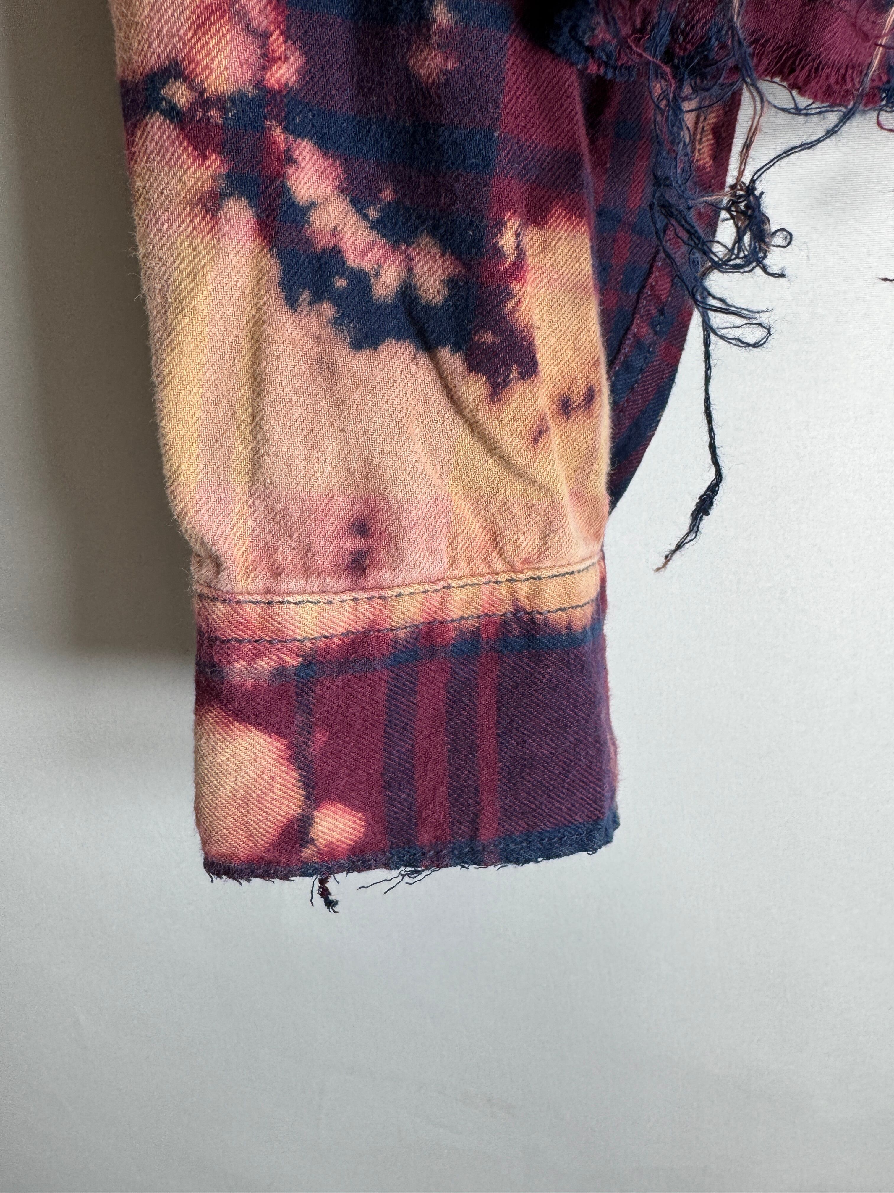 usedのネルシャツを特殊ブリーチし、前立てサイドにジッパーを付属した2wayのリメイクシャツです。襟、裾、前立て、袖端はすべてカットオフにしてグランジ感を出しています。ジッパーは全開閉しますのでシャツブルゾンの感覚で羽織って頂け、またボタンを留めて通常のシャツの感覚でもご利用頂けます。
