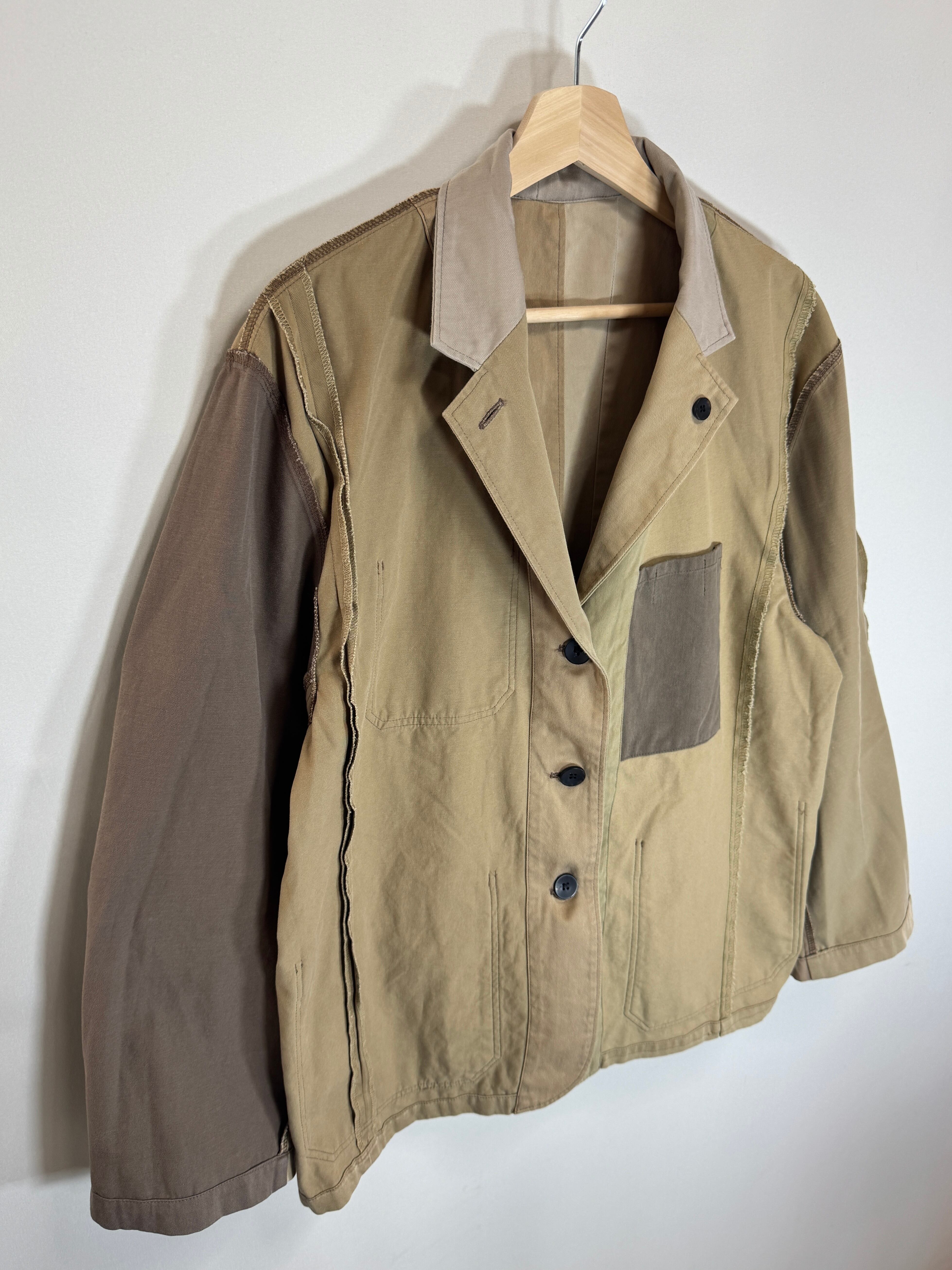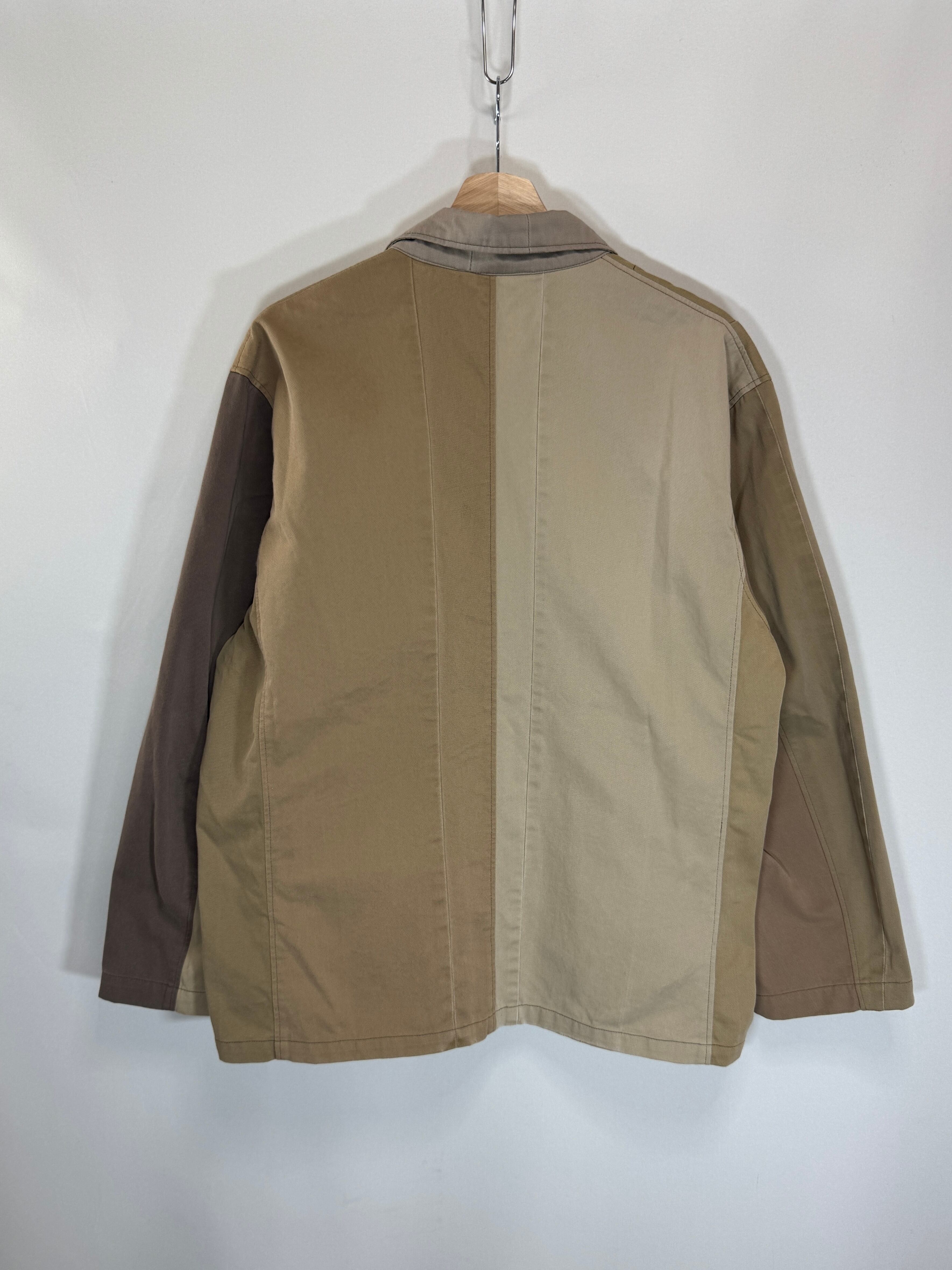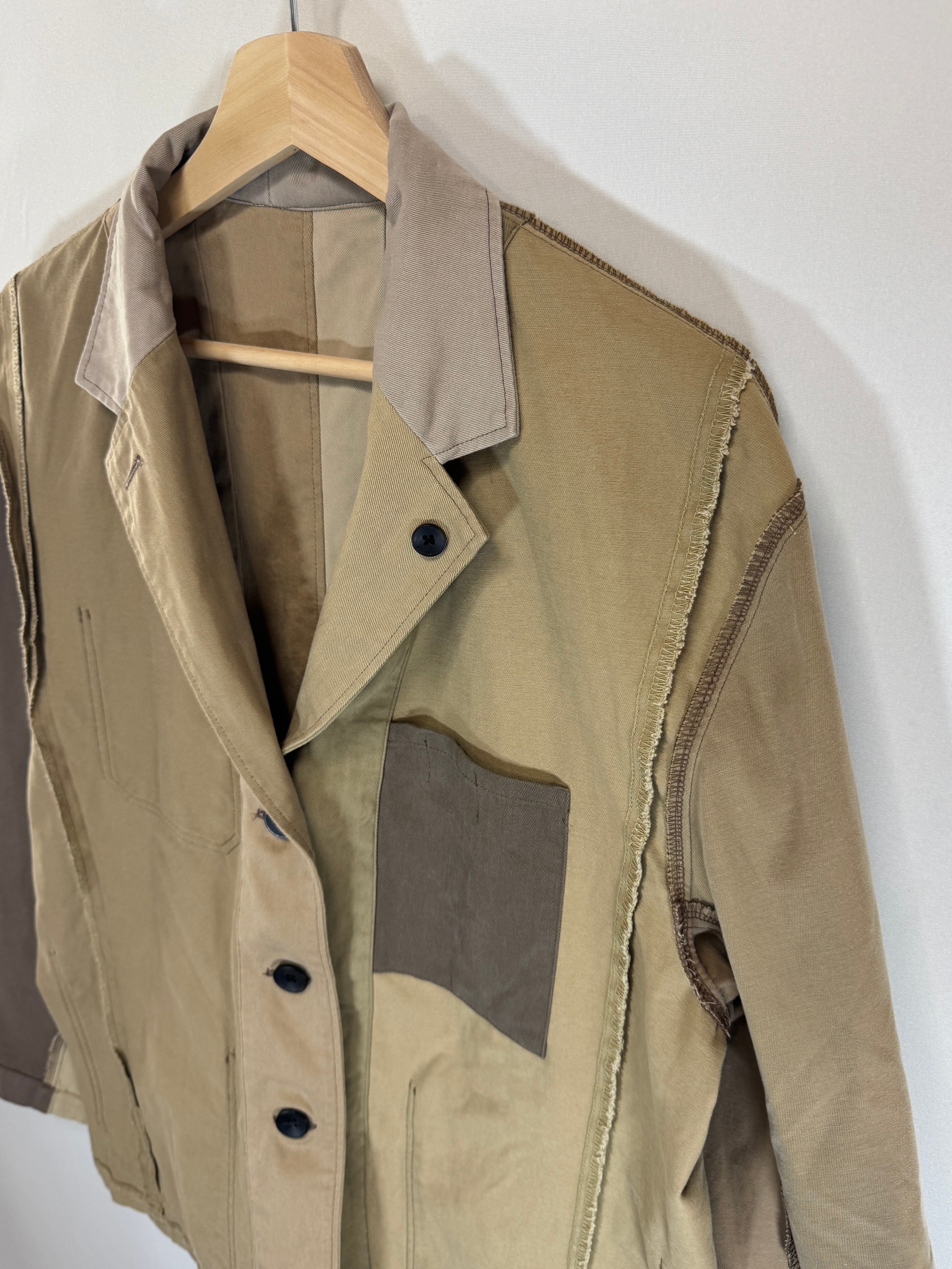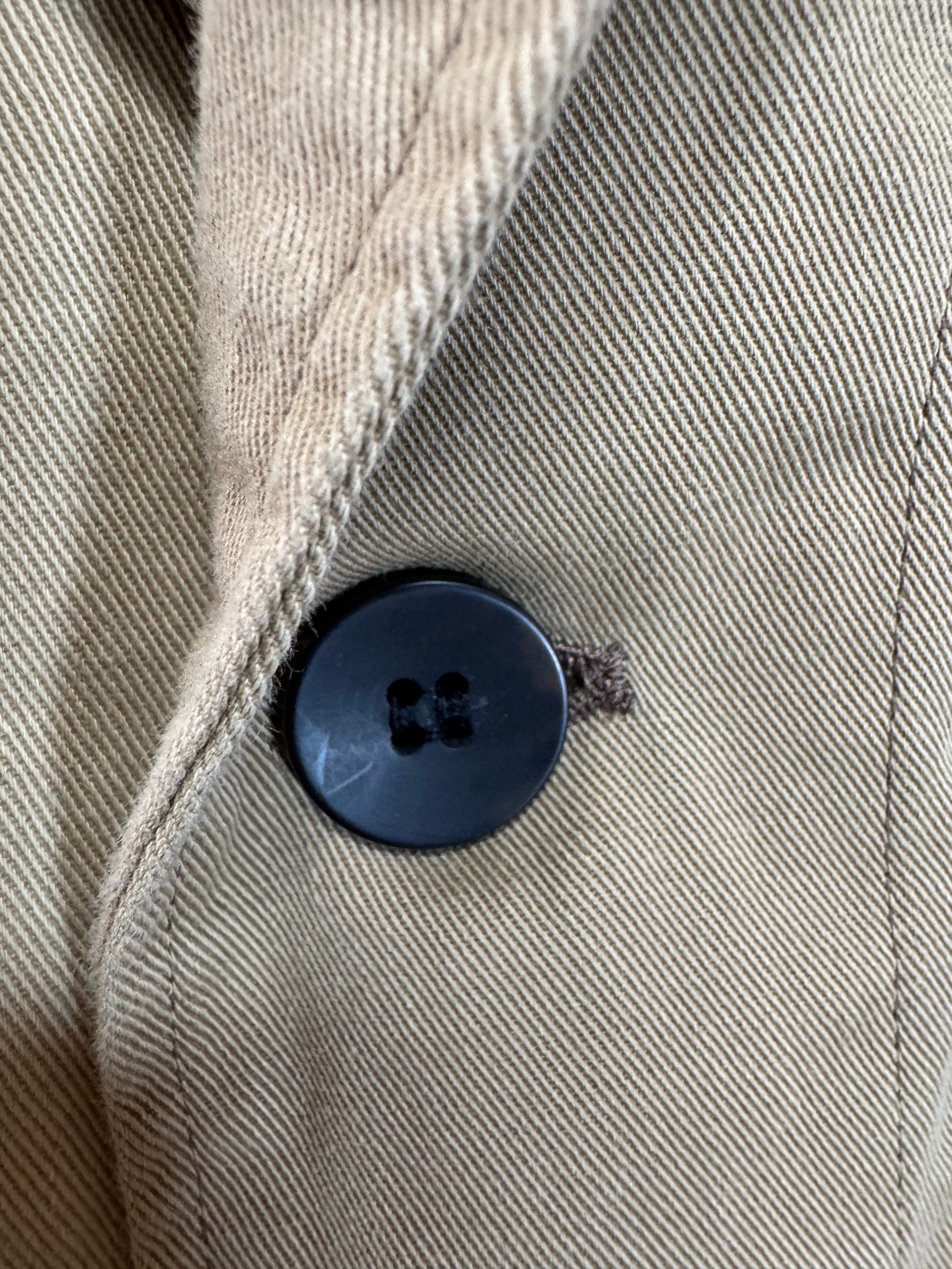 古着のラルフローレンなどのチノパンツを解体し、ヴィンテージのワークジャケットをイメージして一枚仕立てで製作しました。チノ素材特有の程よいハリ感と、古着ならではの風合いが合わさり、着込むほどに雰囲気が増していきます。