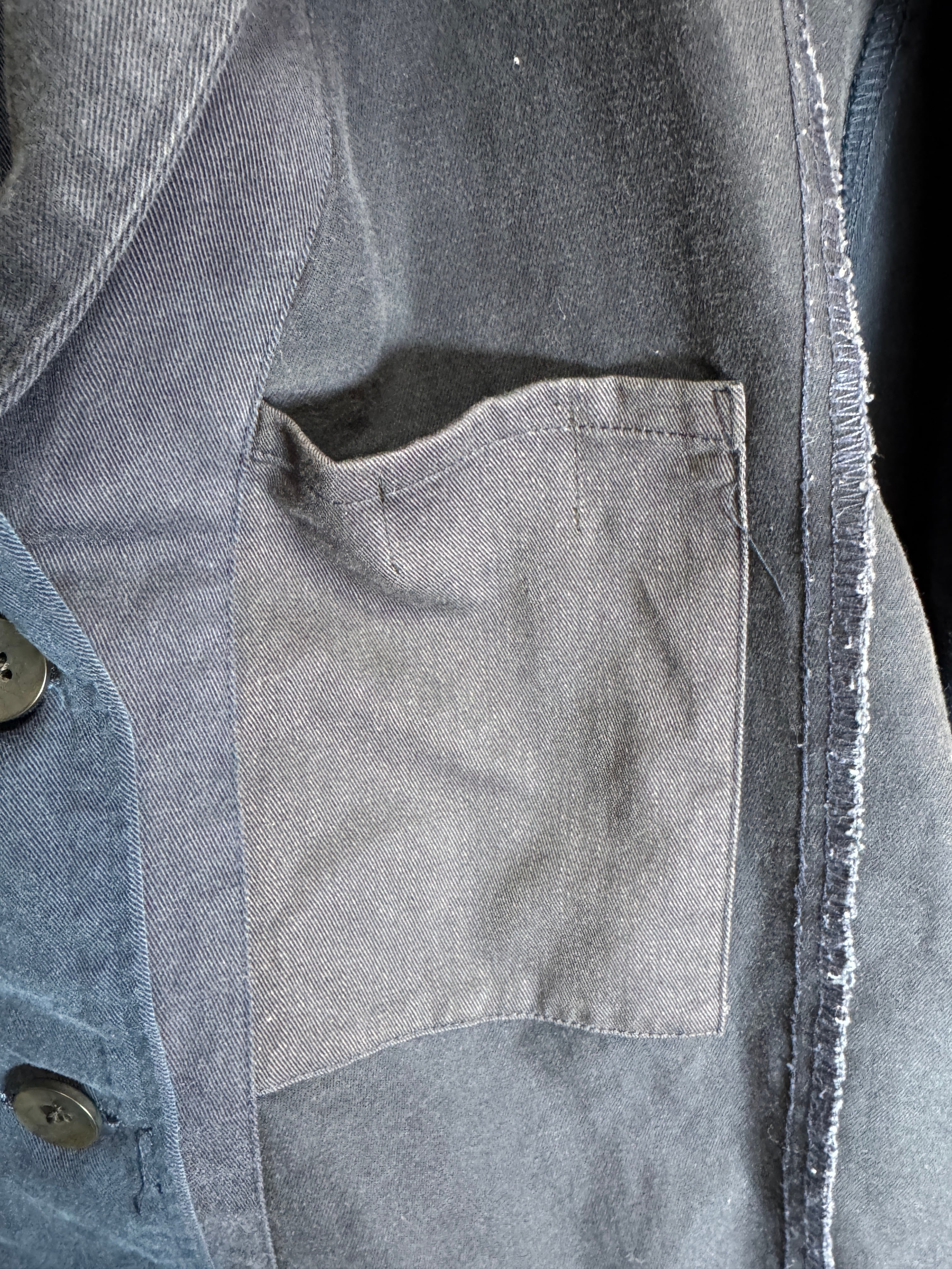 古着のラルフローレンなどのチノパンツを解体し、ヴィンテージのワークジャケットをイメージして一枚仕立てで製作しました。チノ素材特有の程よいハリ感と、古着ならではの風合いが合わさり、着込むほどに雰囲気が増していきます。