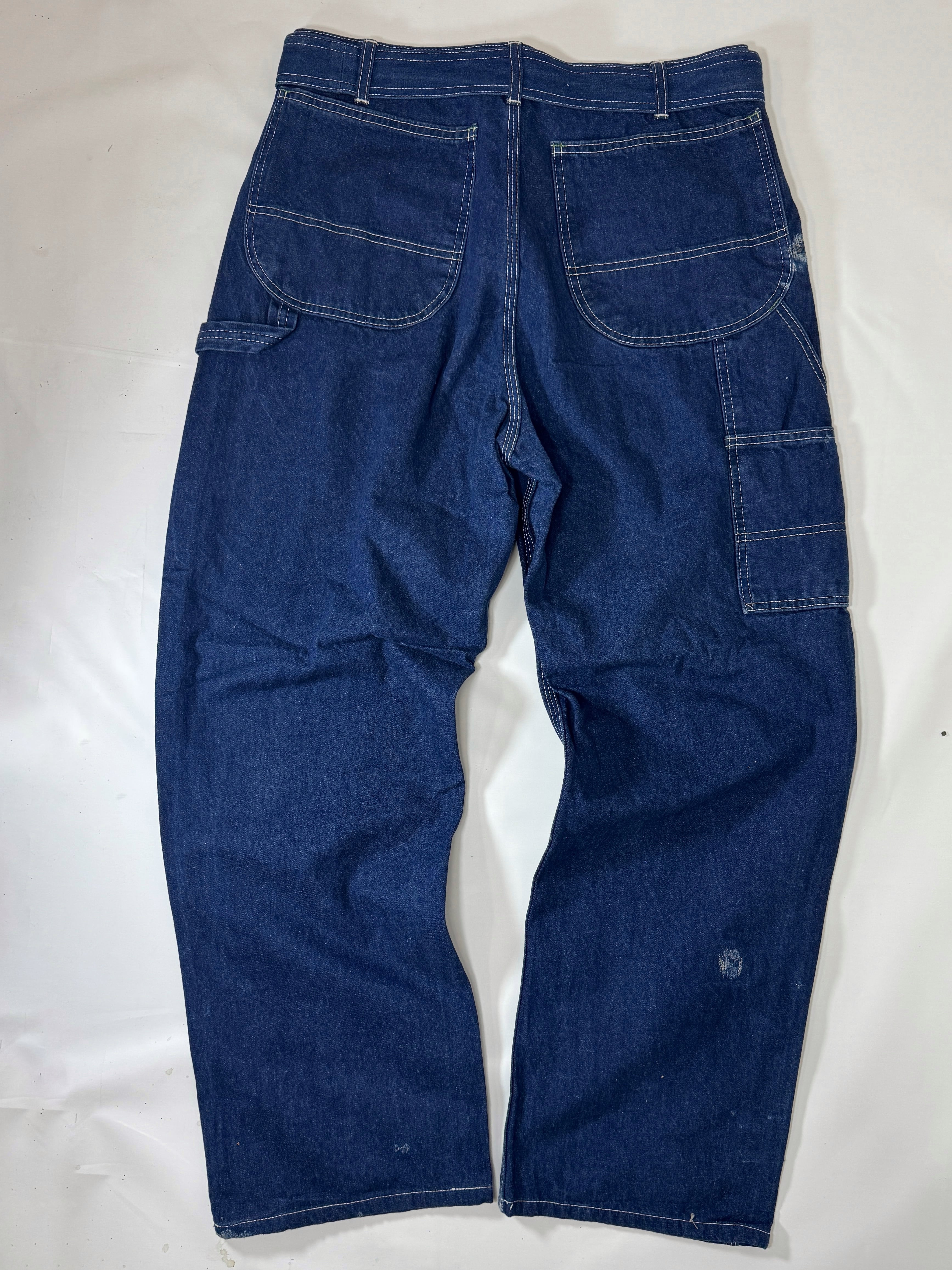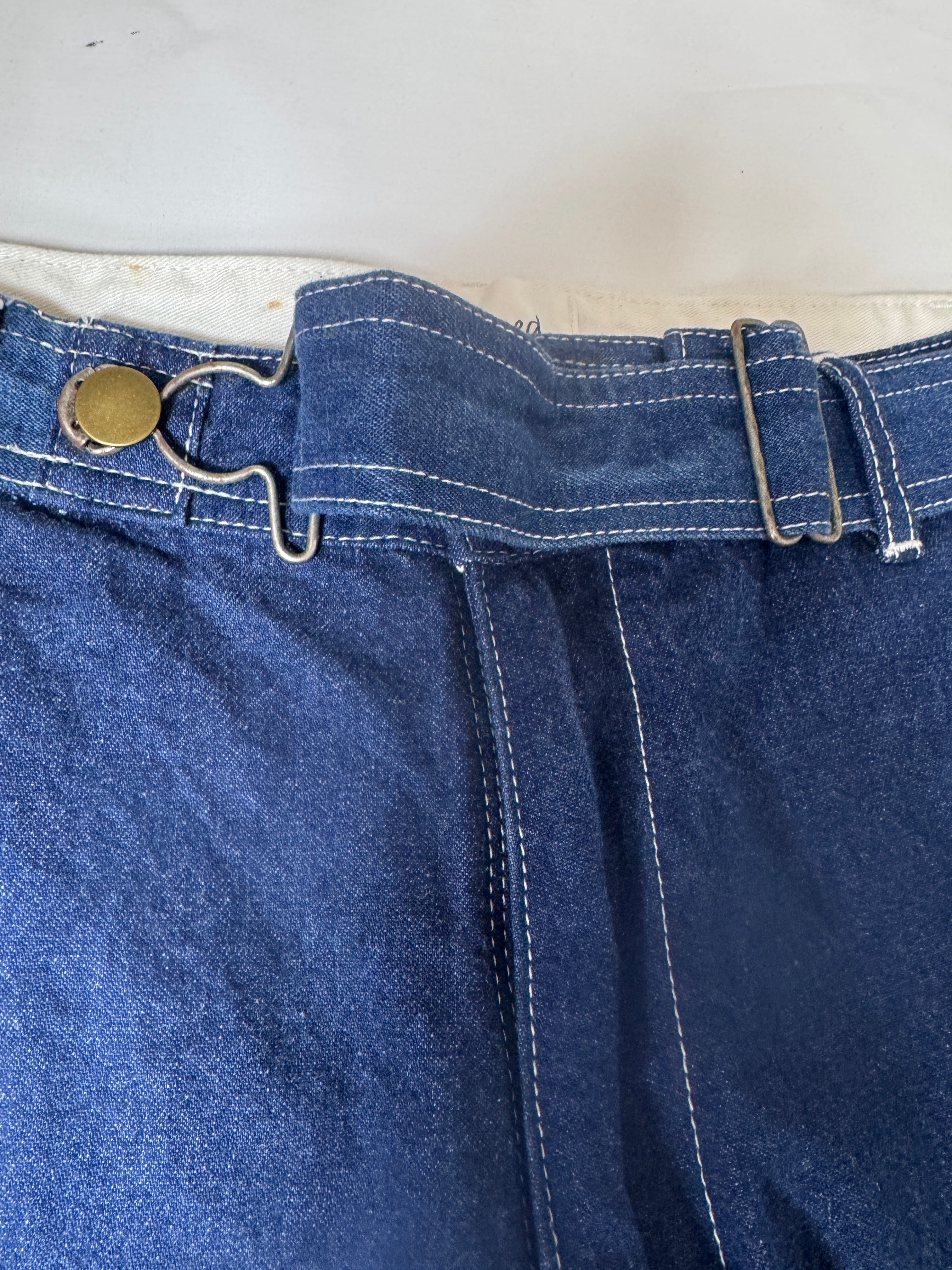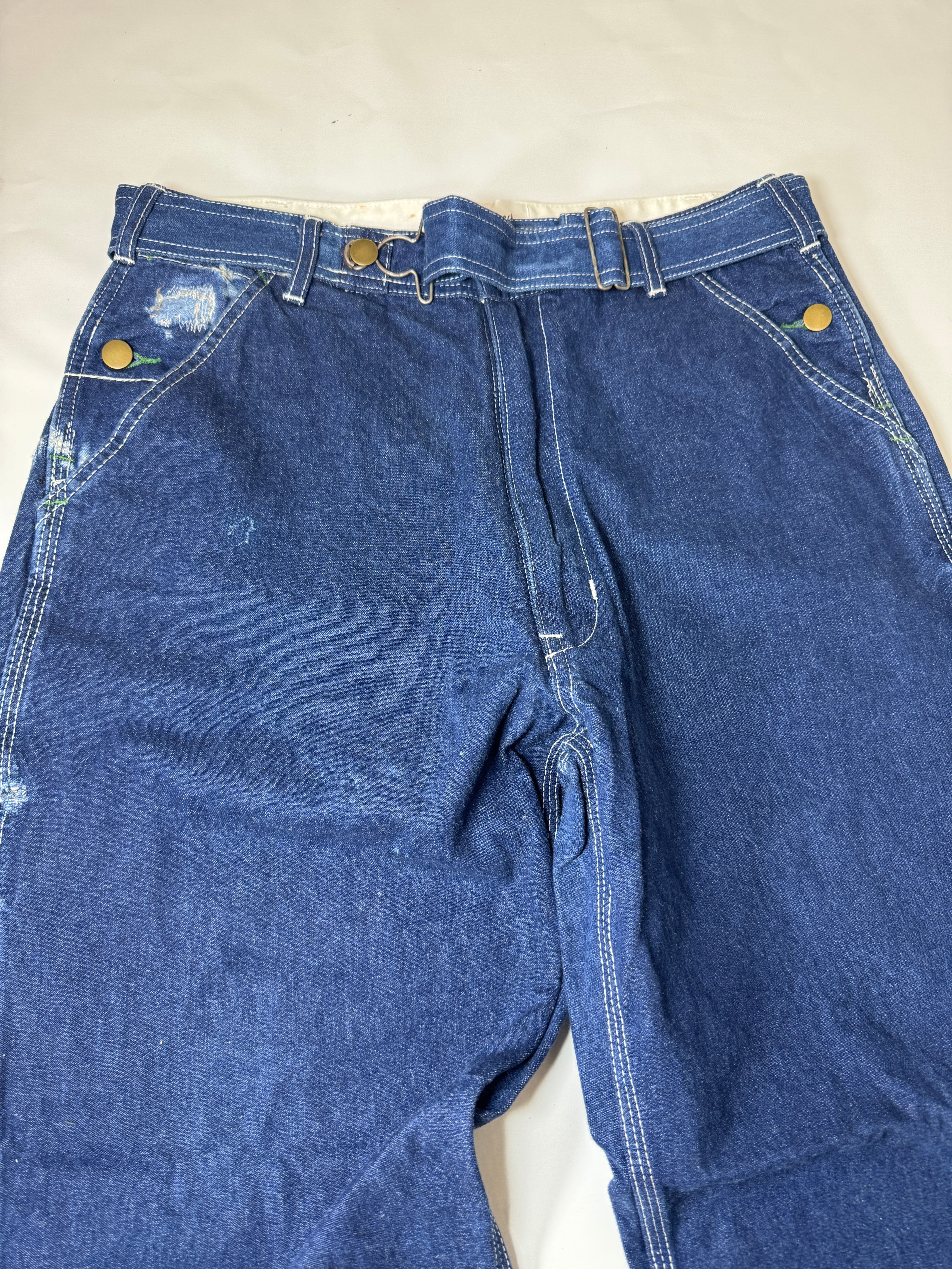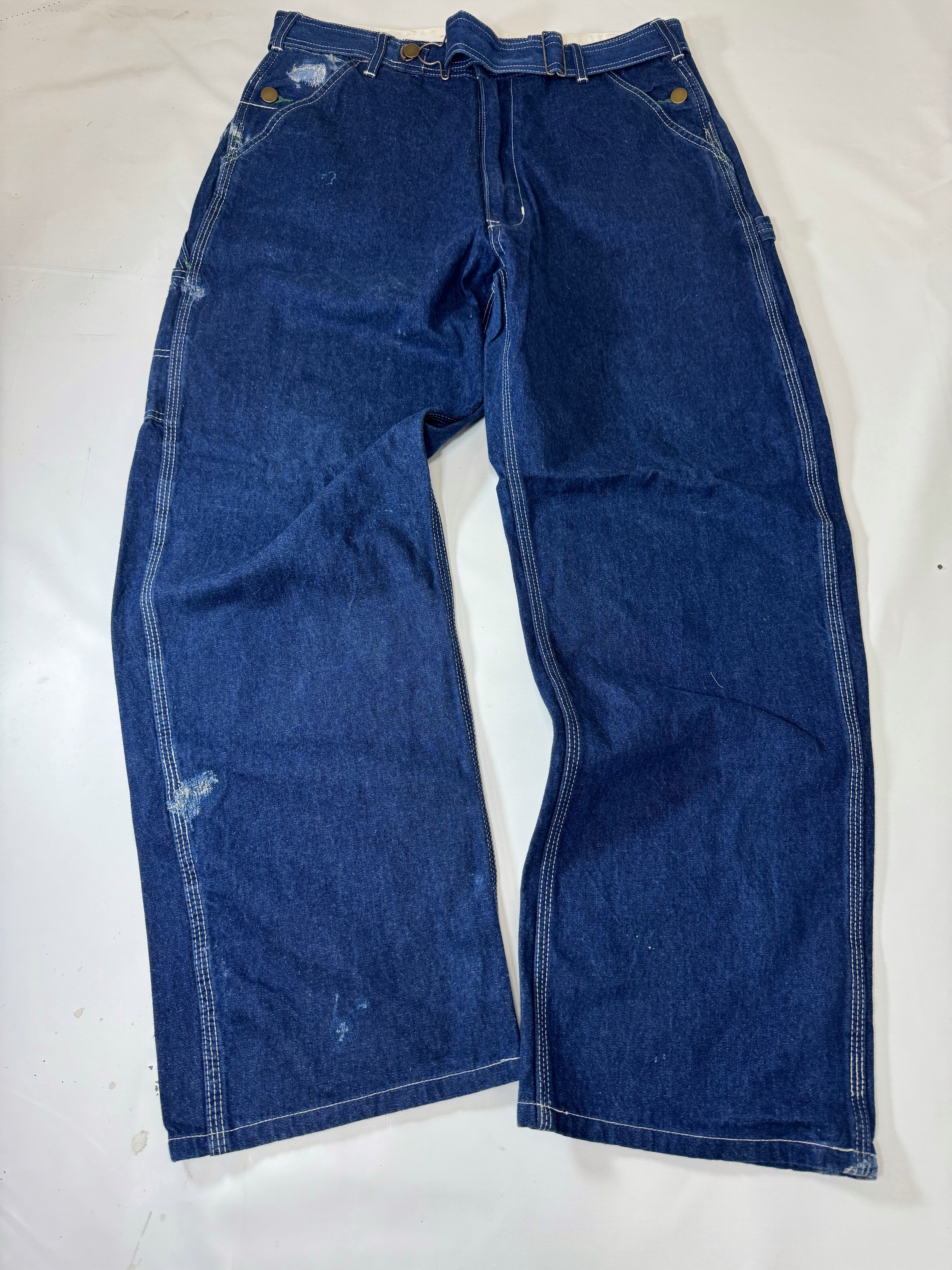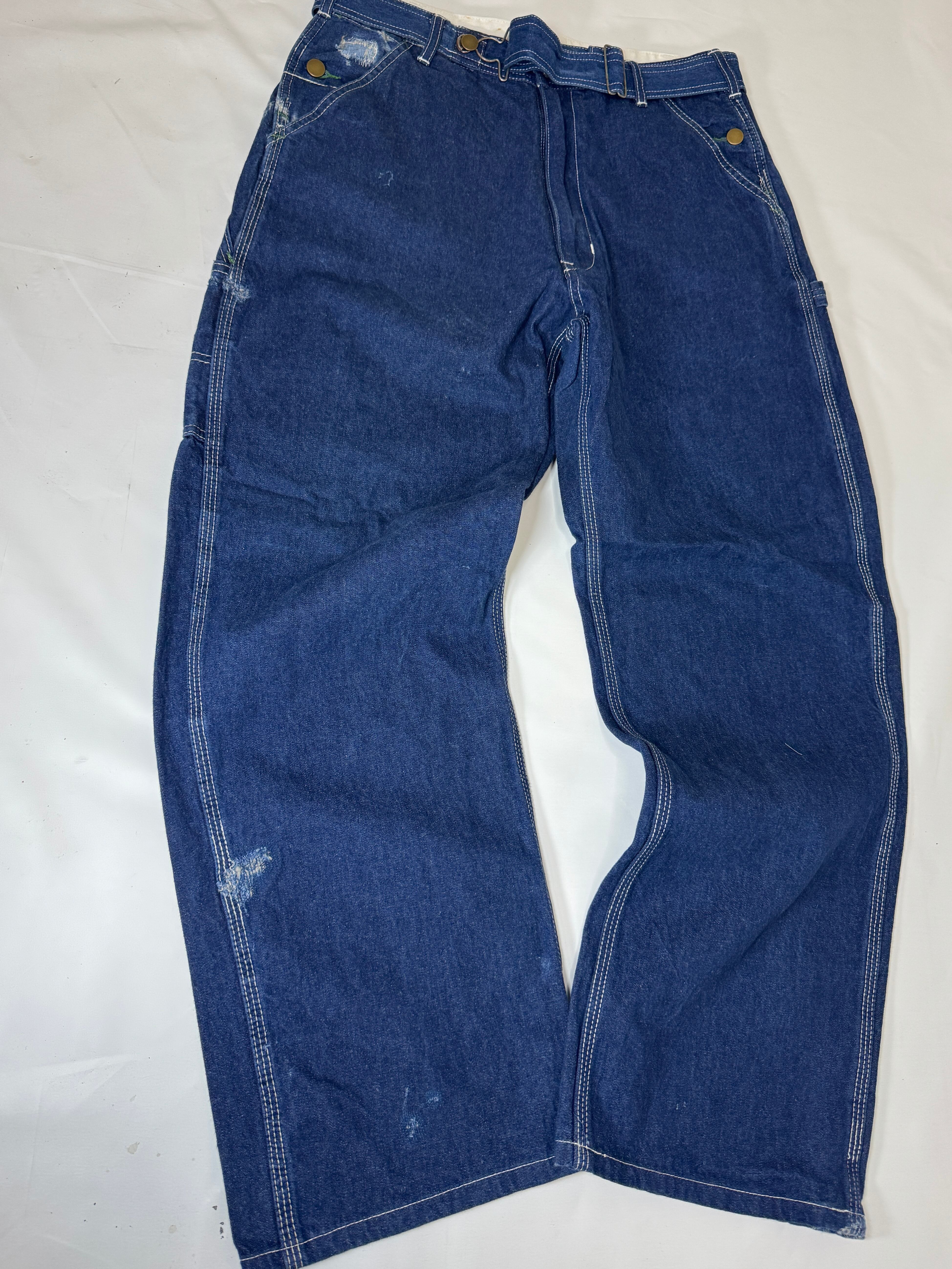 古着のオーバーオールの上部を解体してペインターパンツにリメイクしました。主に90年代のUSAものに特化してボディを選んでますので生地感、色落ちなど雰囲気良くヴィンテージのペインターパンツに近い仕上がりとなっています。ウエストはオーバーオールの肩ひも部分を利用してアジャスター式のベルトに作り替えてあります。股上も深いのでタックインしても綺麗なシルエットです。サイズは1と2の2サイズ展開です。一つ一つもとのボディにより微妙にディテールサイズが違いますのでお求めの際は詳細寸法をよくご覧くださいますようお願い致します。