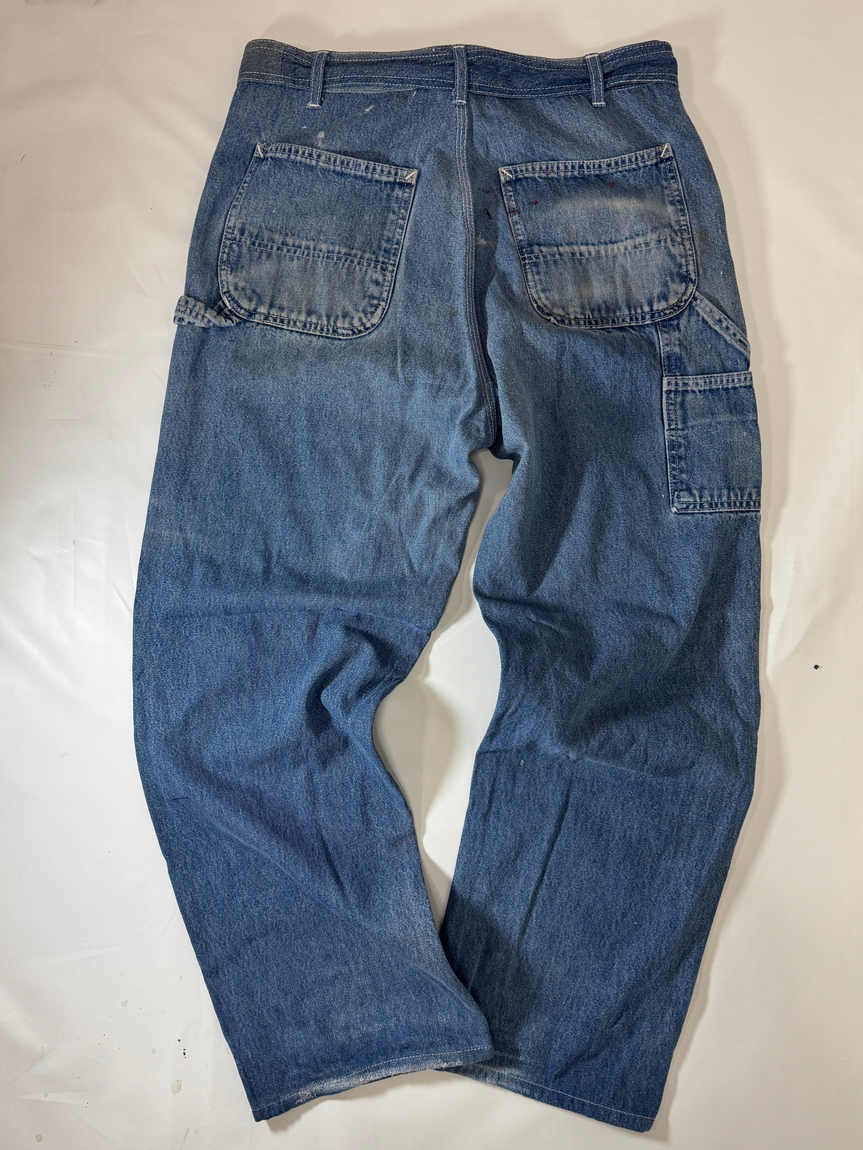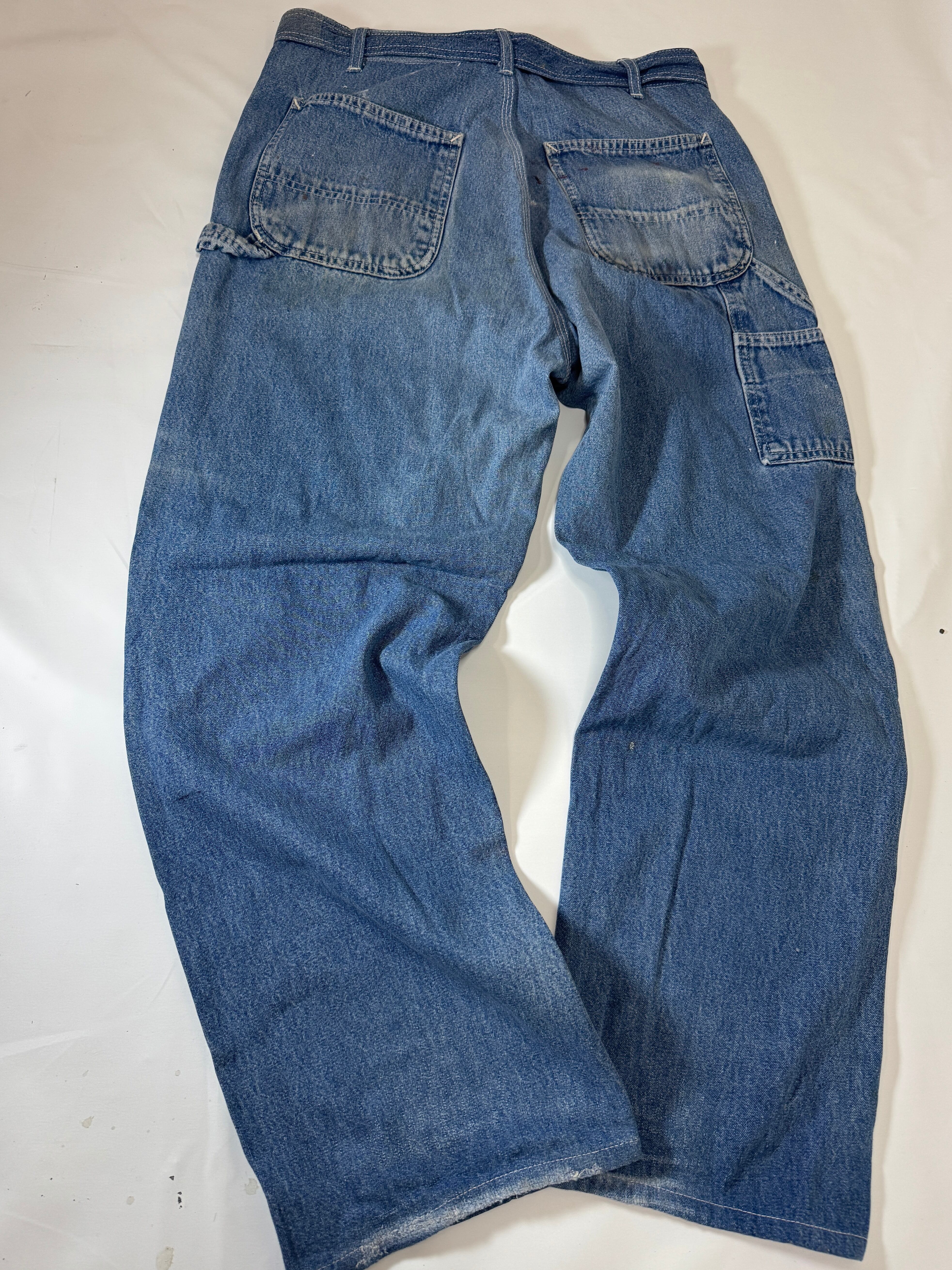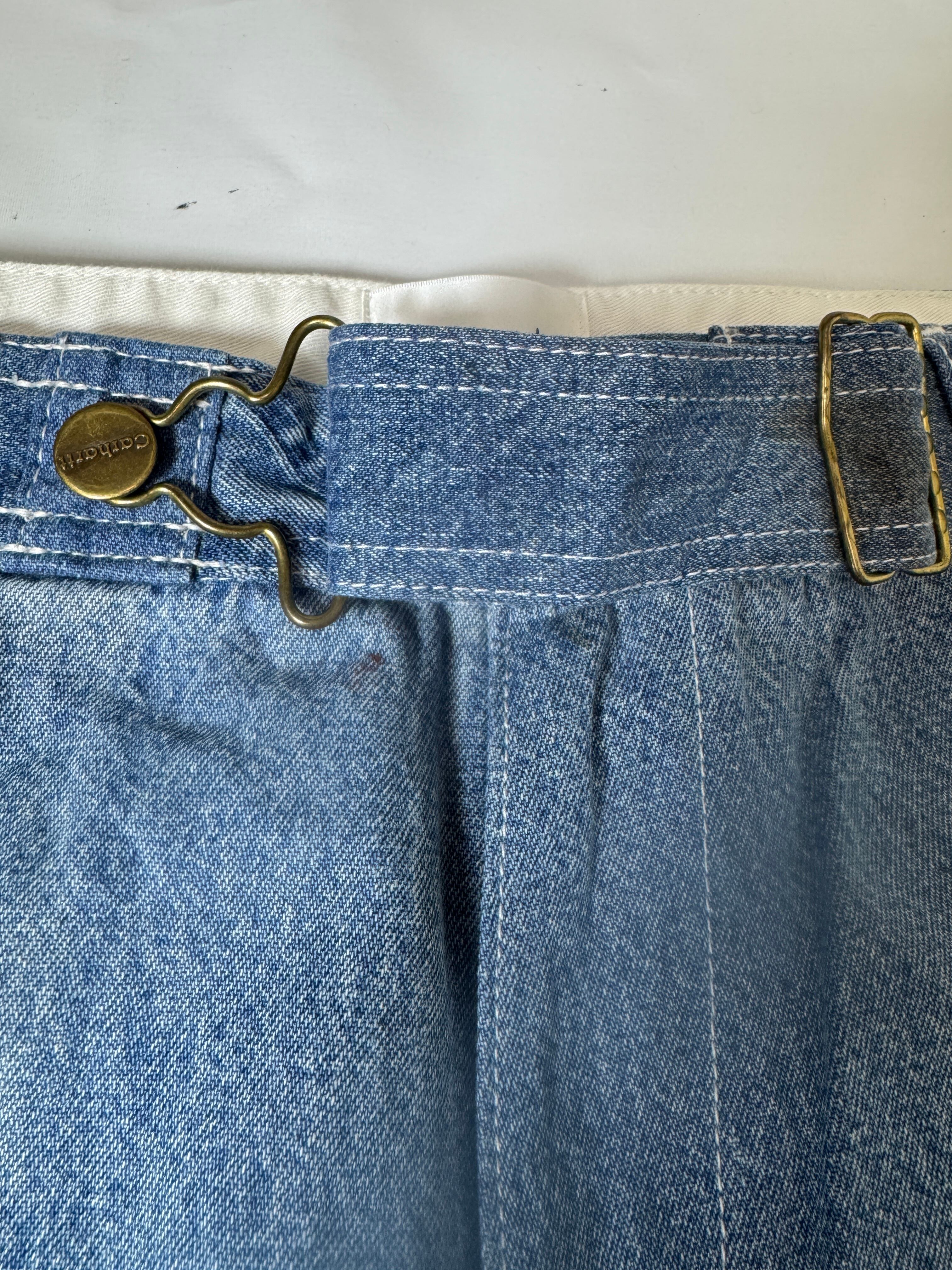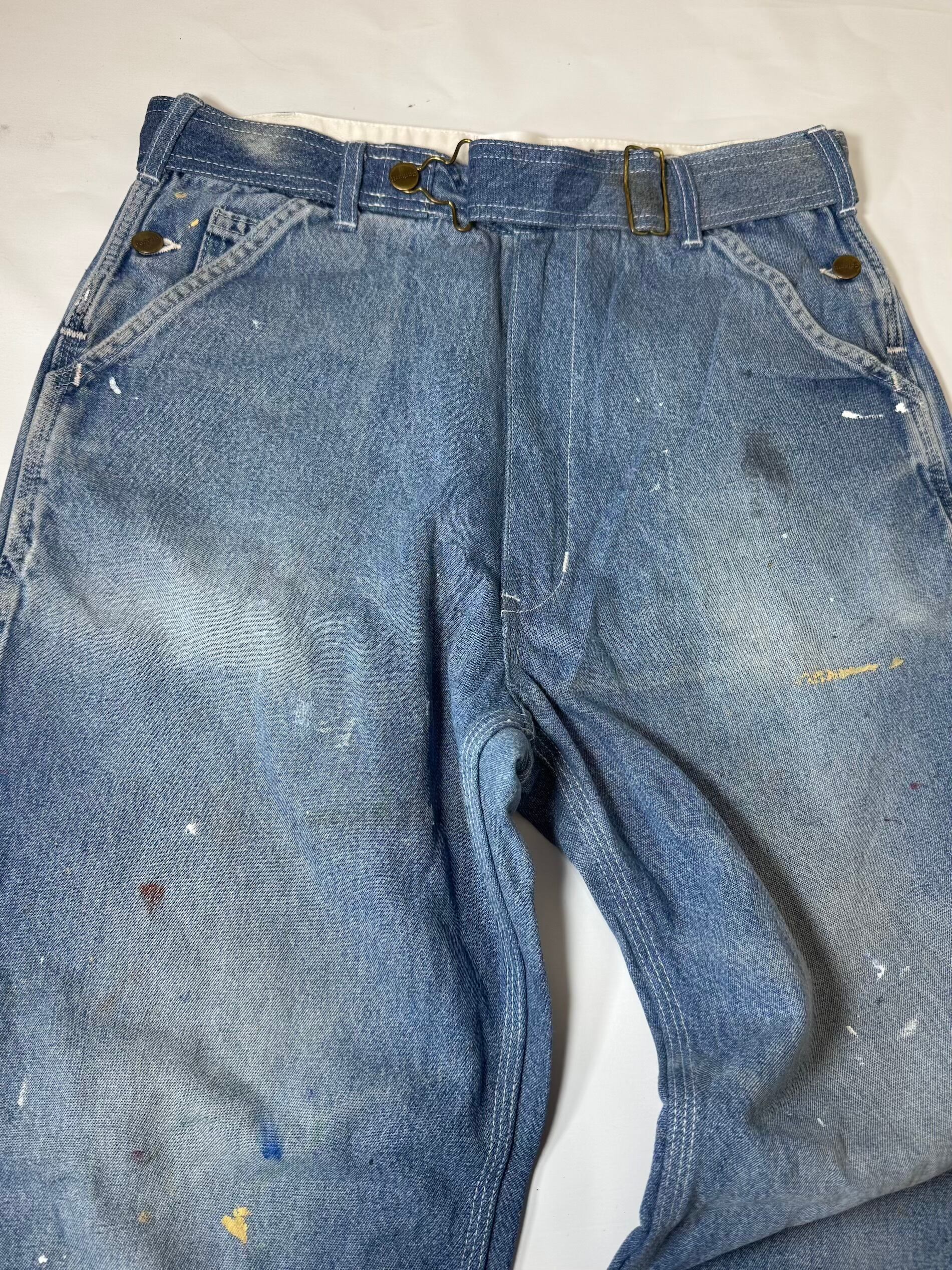 古着のオーバーオールの上部を解体してペインターパンツにリメイクしました。主に90年代のUSAものに特化してボディを選んでますので生地感、色落ちなど雰囲気良くヴィンテージのペインターパンツに近い仕上がりとなっています。ウエストはオーバーオールの肩ひも部分を利用してアジャスター式のベルトに作り替えてあります。股上も深いのでタックインしても綺麗なシルエットです。サイズは1と2の2サイズ展開です。一つ一つもとのボディにより微妙にディテールサイズが違いますのでお求めの際は詳細寸法をよくご覧くださいますようお願い致します。