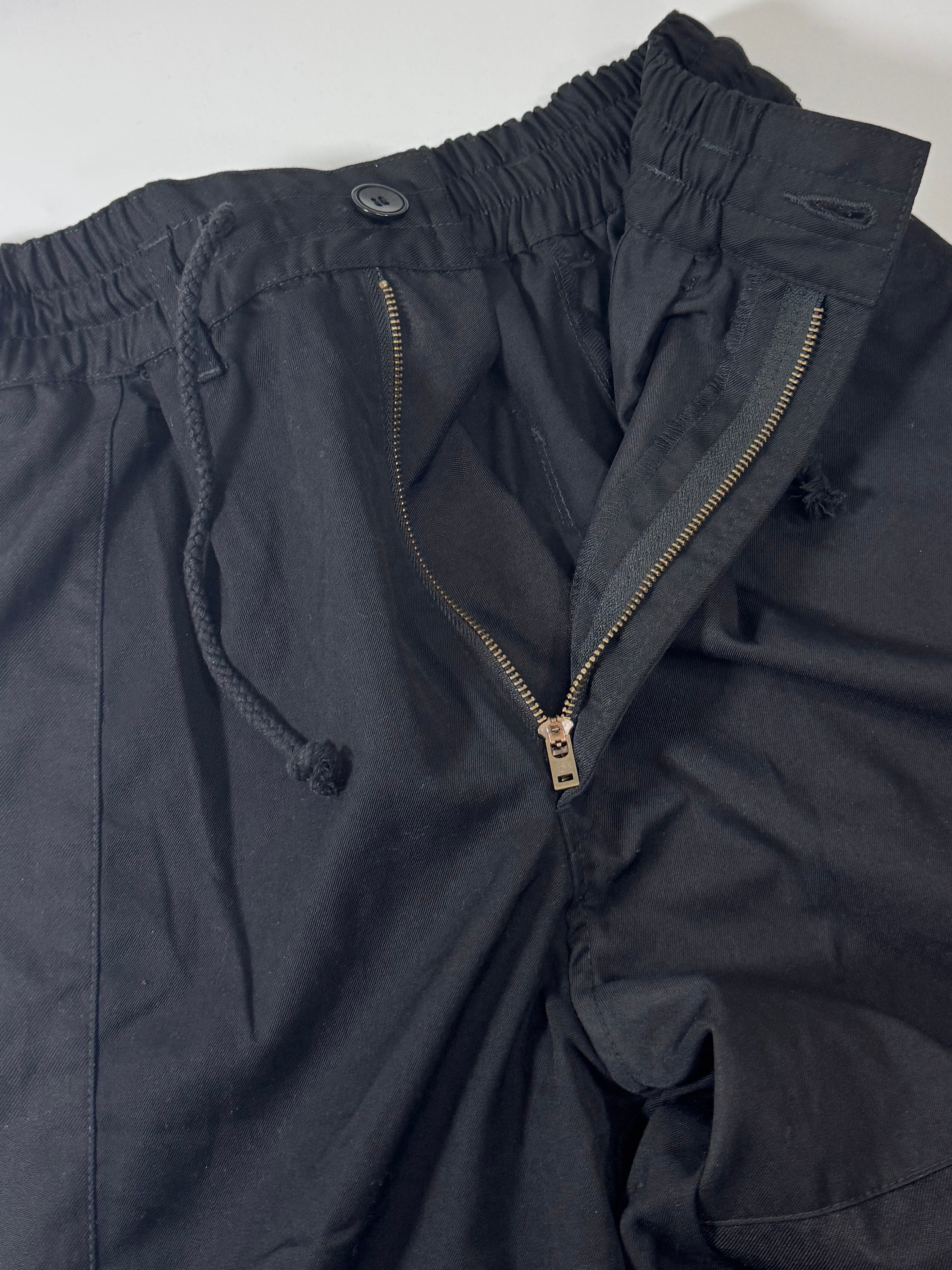 非常に太めのワタリから緩やかにテーパードがかかったシルエット。見た目のボリュームに反して軽量で、穿き心地にストレスはありません。ウエストはしっかりとした3段ゴム仕様で、体にフィットしながらも緩くなりにくい作りです。ワンタック入りのハイウエスト設計で脚長効果も◎。前後4つのポケット付きで、実用性も兼ね備えています。