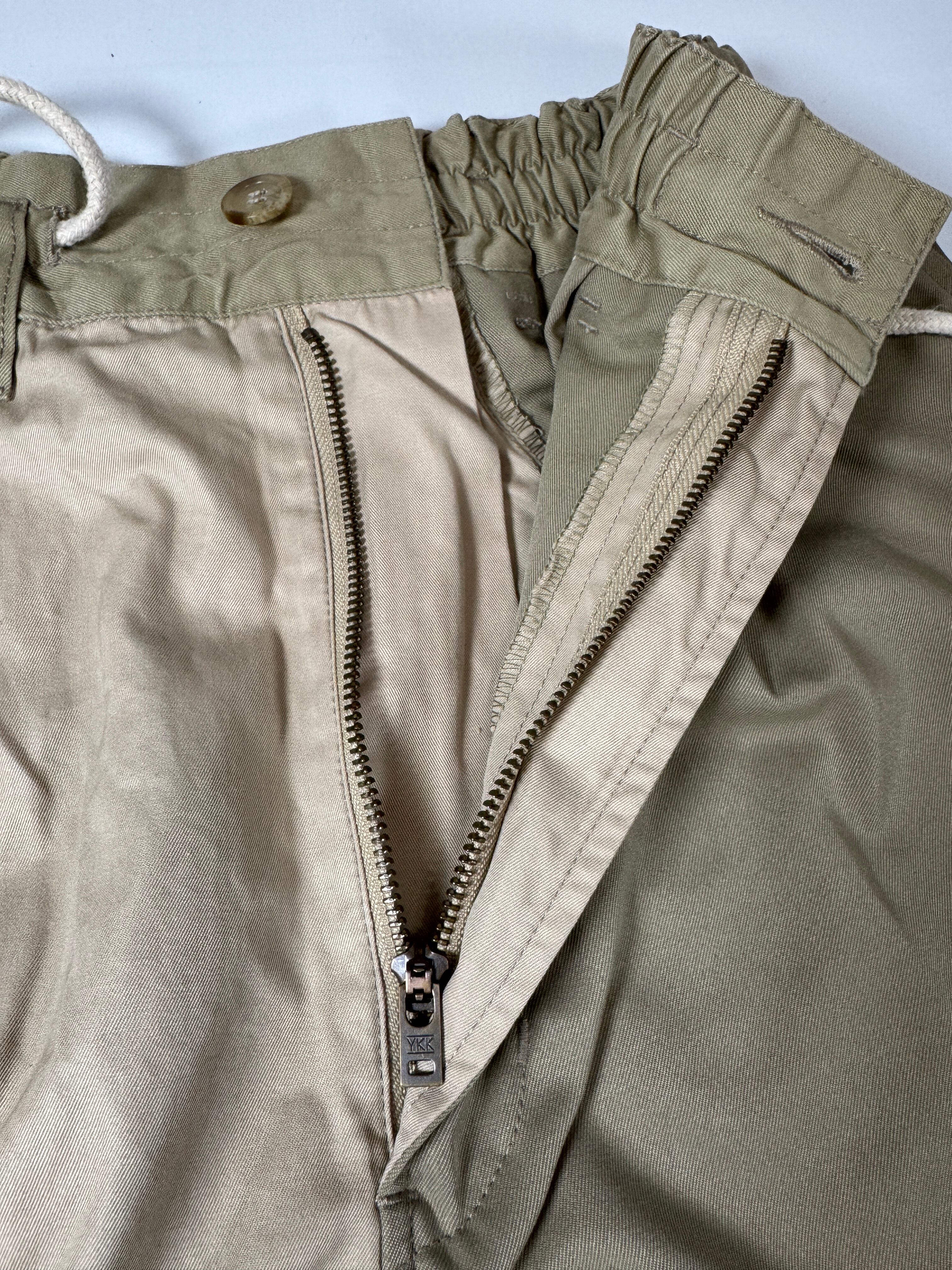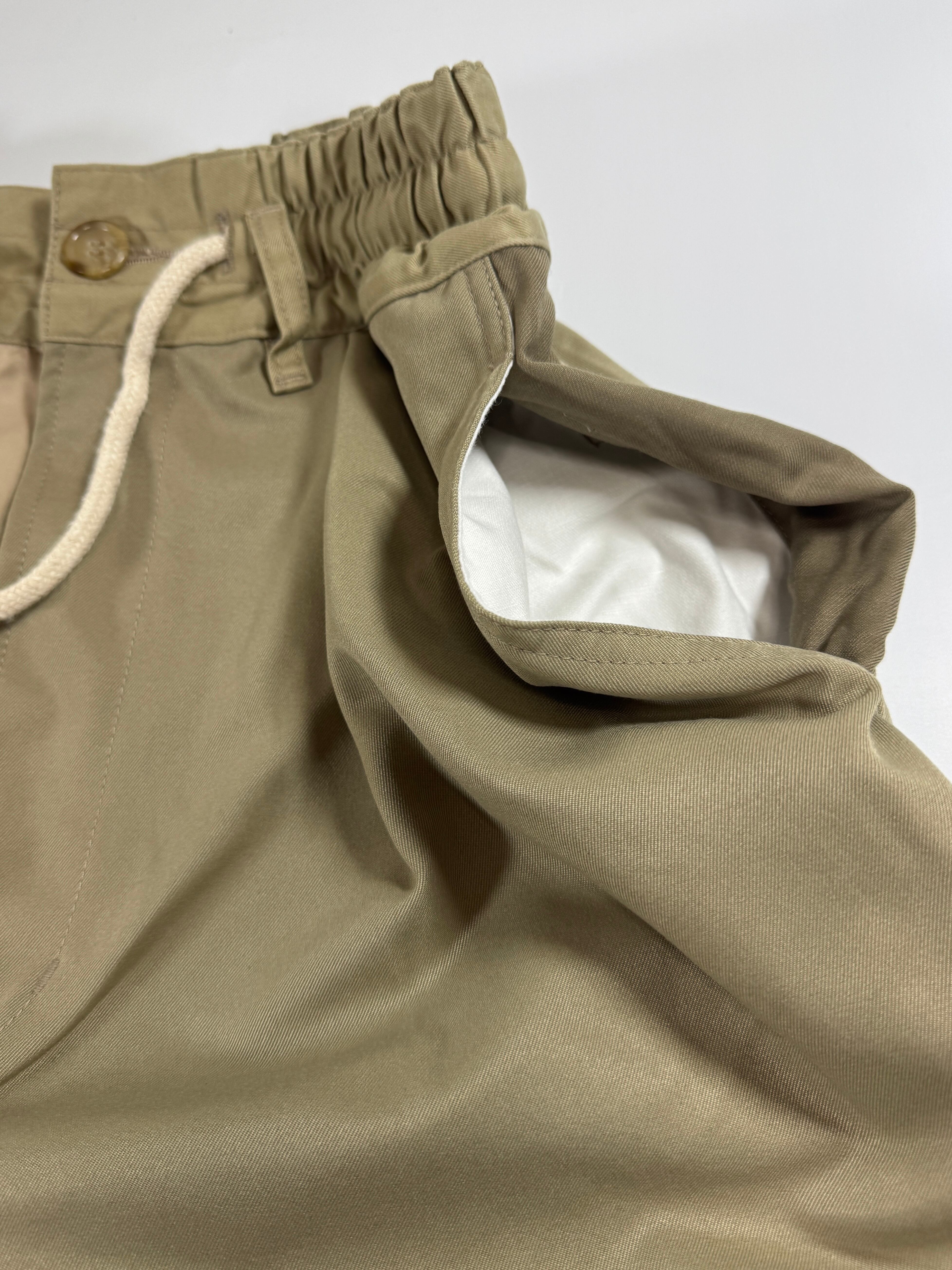 非常に太めのワタリから緩やかにテーパードがかかったシルエット。見た目のボリュームに反して軽量で、穿き心地にストレスはありません。ウエストはしっかりとした3段ゴム仕様で、体にフィットしながらも緩くなりにくい作りです。ワンタック入りのハイウエスト設計で脚長効果も◎。前後4つのポケット付きで、実用性も兼ね備えています。
