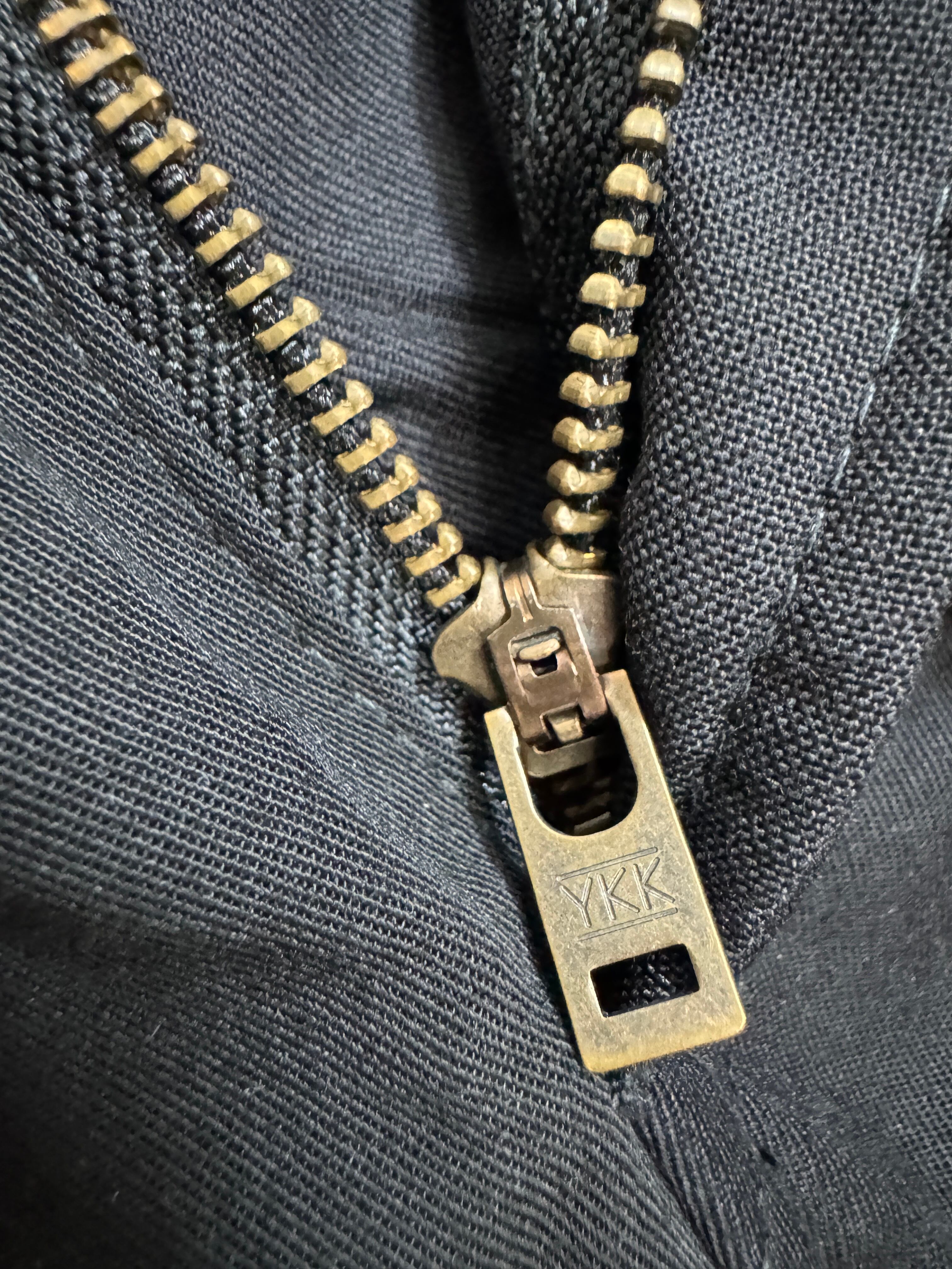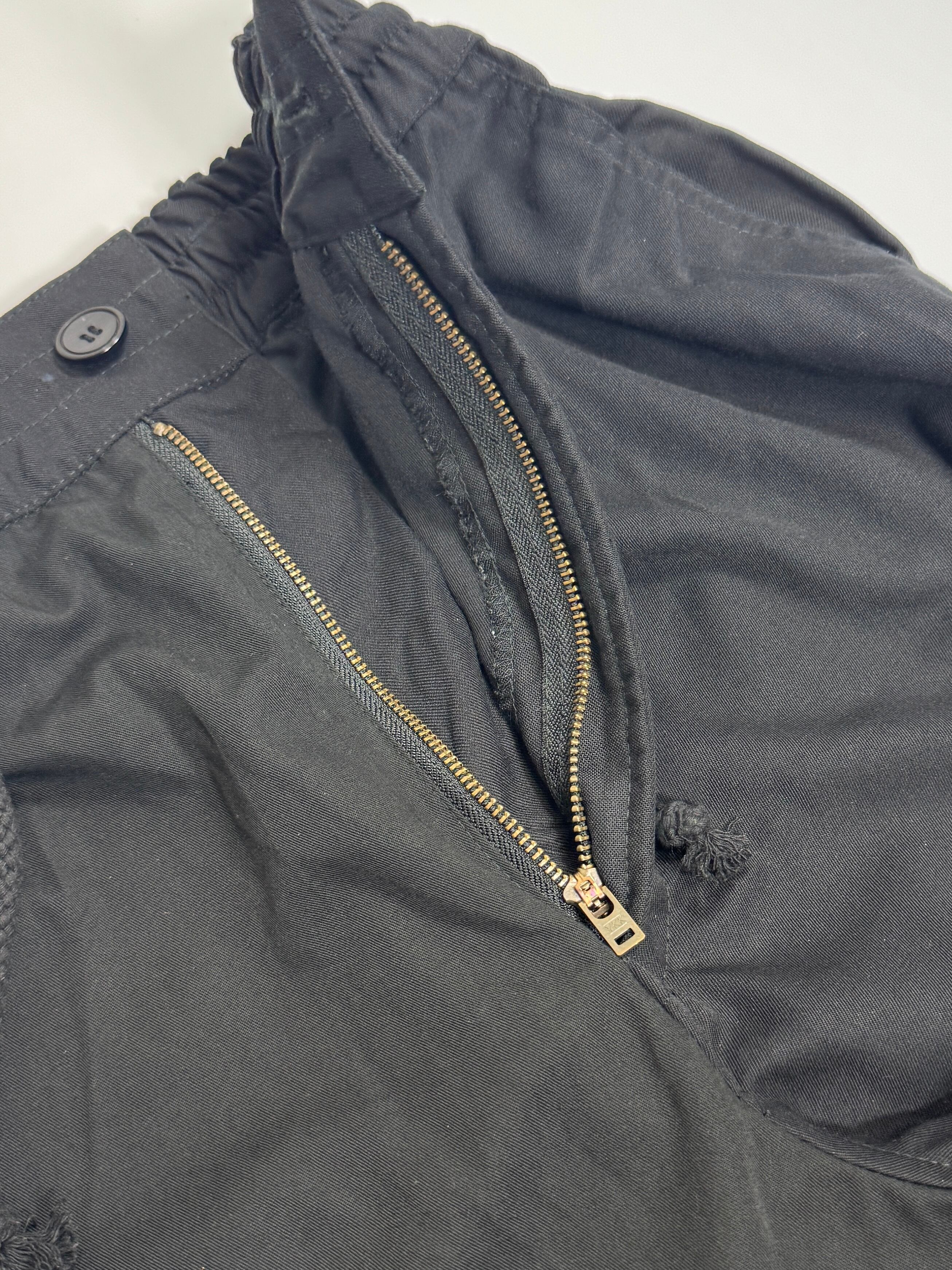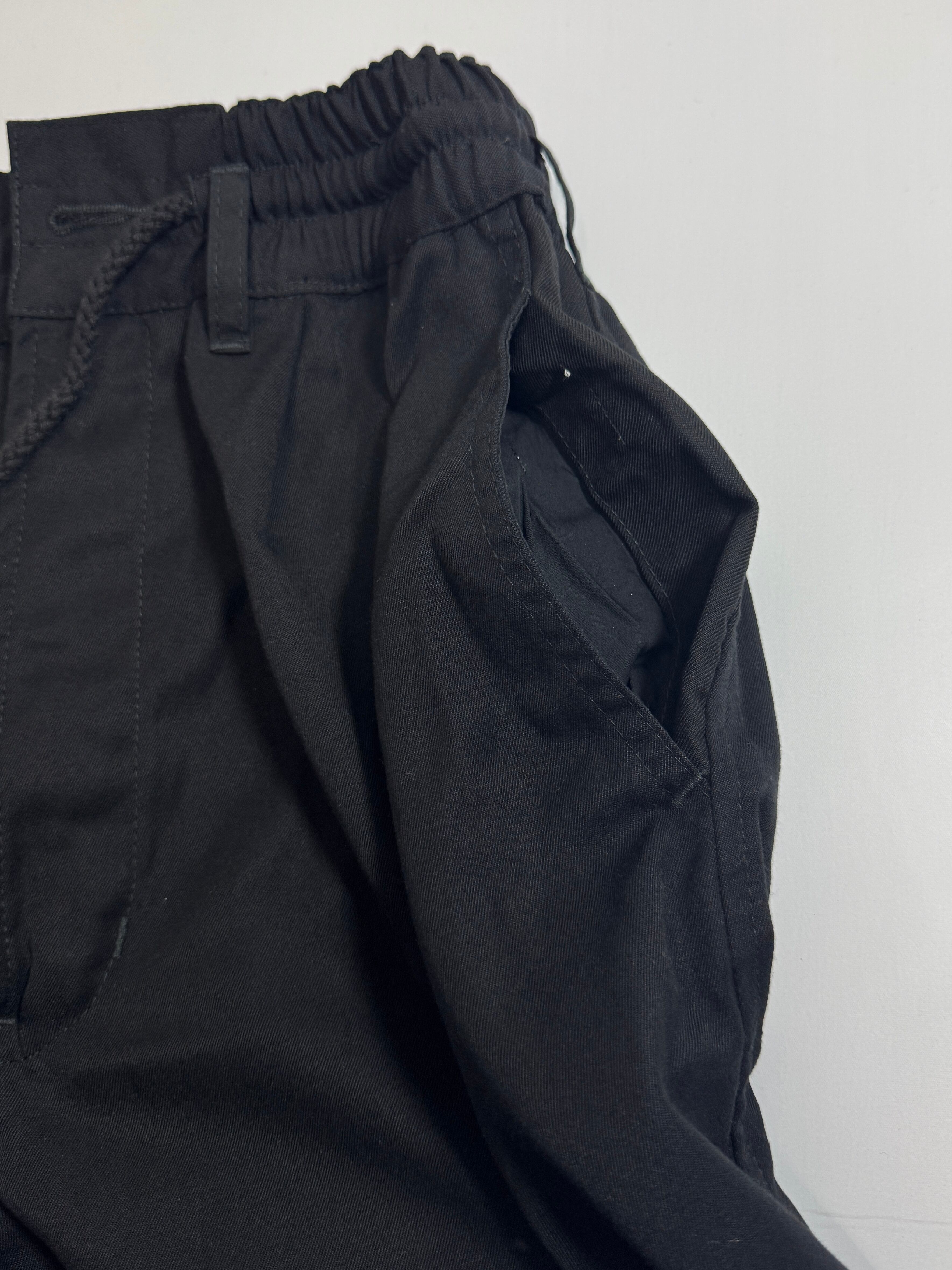 非常に太めのワタリから緩やかにテーパードがかかったシルエット。見た目のボリュームに反して軽量で、穿き心地にストレスはありません。ウエストはしっかりとした3段ゴム仕様で、体にフィットしながらも緩くなりにくい作りです。ワンタック入りのハイウエスト設計で脚長効果も◎。前後4つのポケット付きで、実用性も兼ね備えています。
